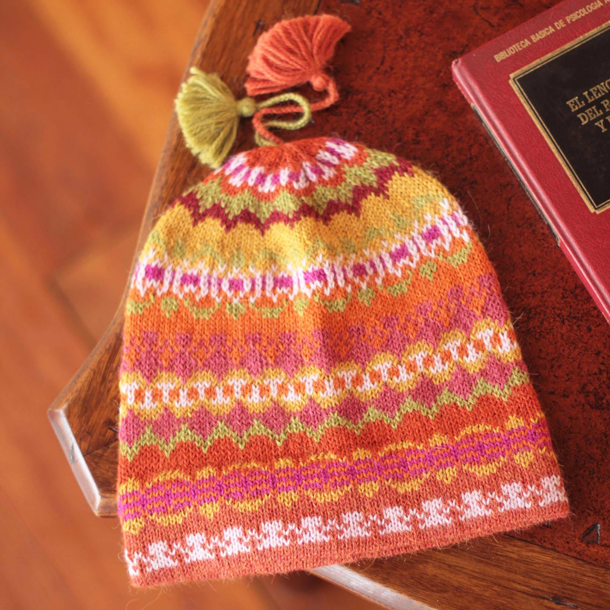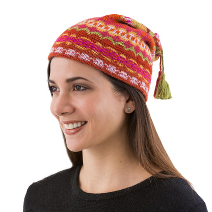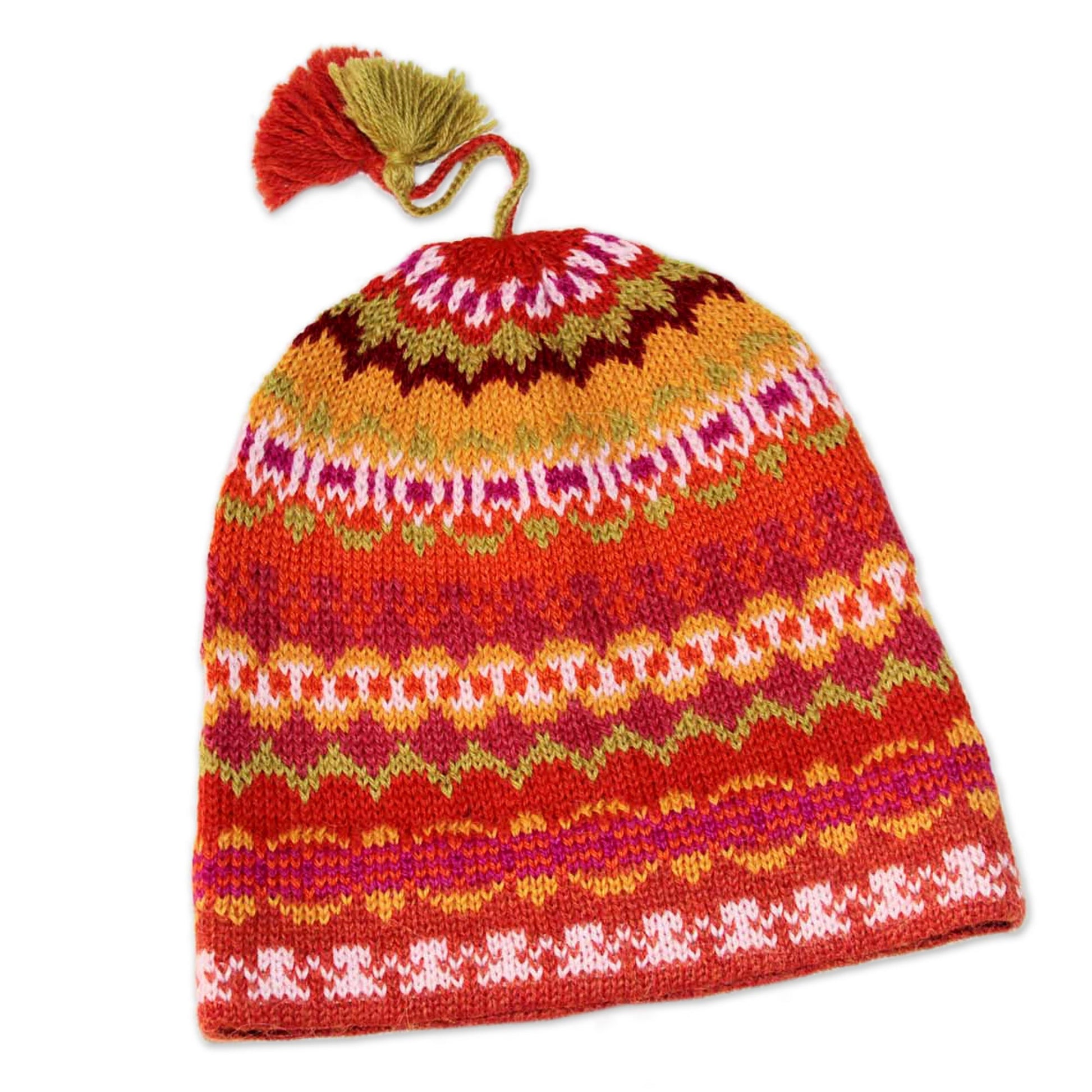 Cheerful and modern, this delightful hat features colorful geometric motifs in yellow, orange, green and ivory. Peru's Fernando Cano knits it of luxurious alpaca, renowned for its lightweight warmth. Tassels crown the cozy hat.