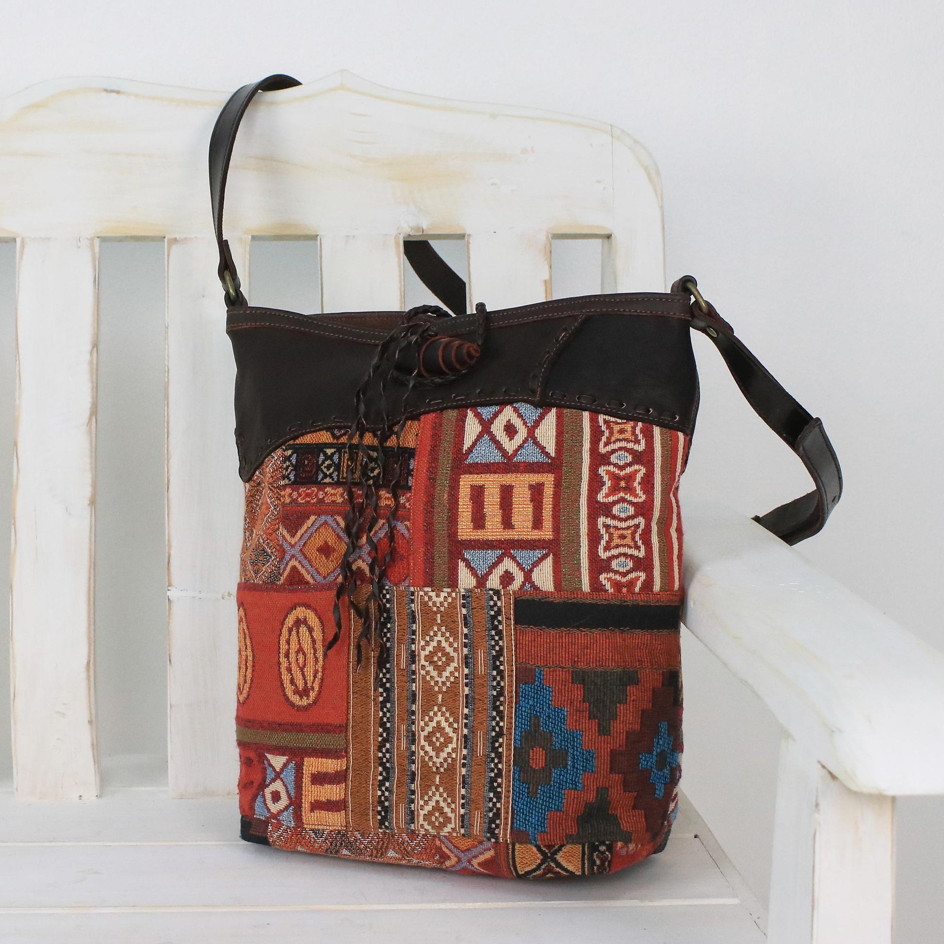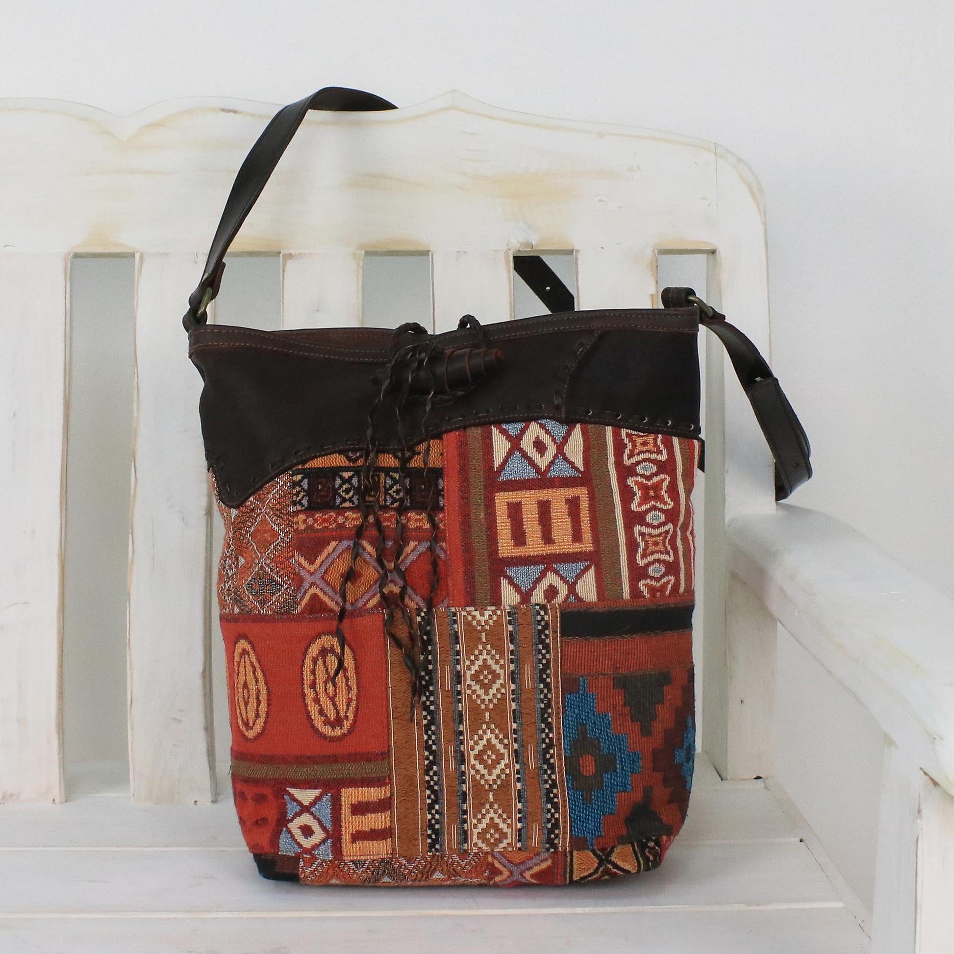 The perfect companion for your next journey, this sling from Thailand is handcrafted of cotton blend material with multicolored geometric patterns that evoke the beauty of the sunrise. Hailing from Chiang Mai, Chirada designs the sling, fitting it with dark brown leather accents and an adjustable strap. The handbag opens with a leather toggle and a zipper to a brown cotton lining with one zipper pocket and two open pockets for storing small items.