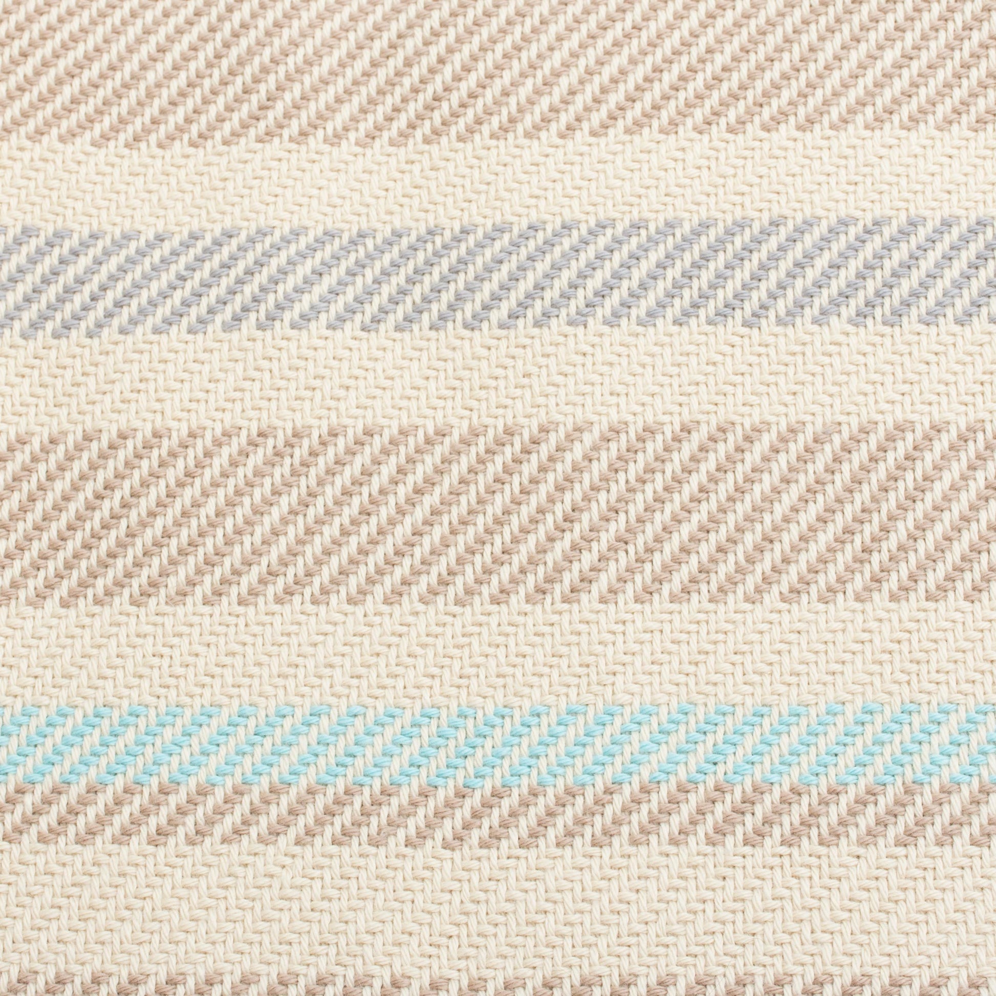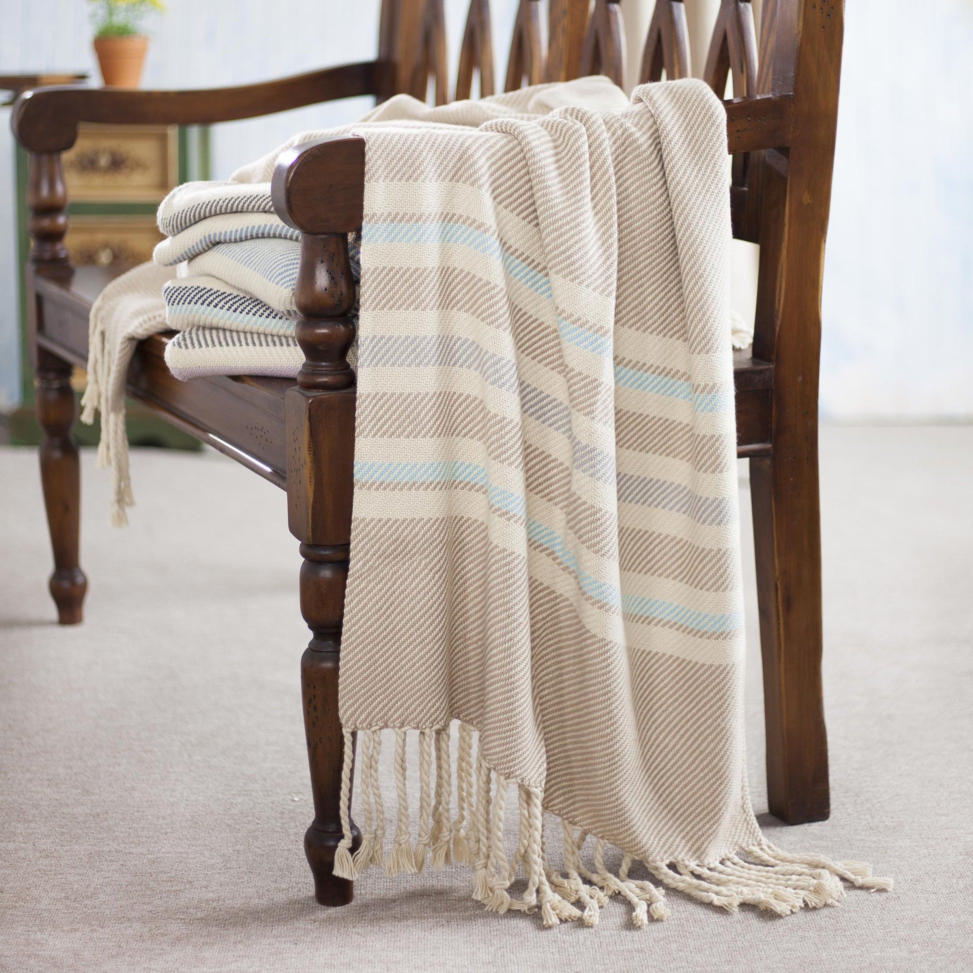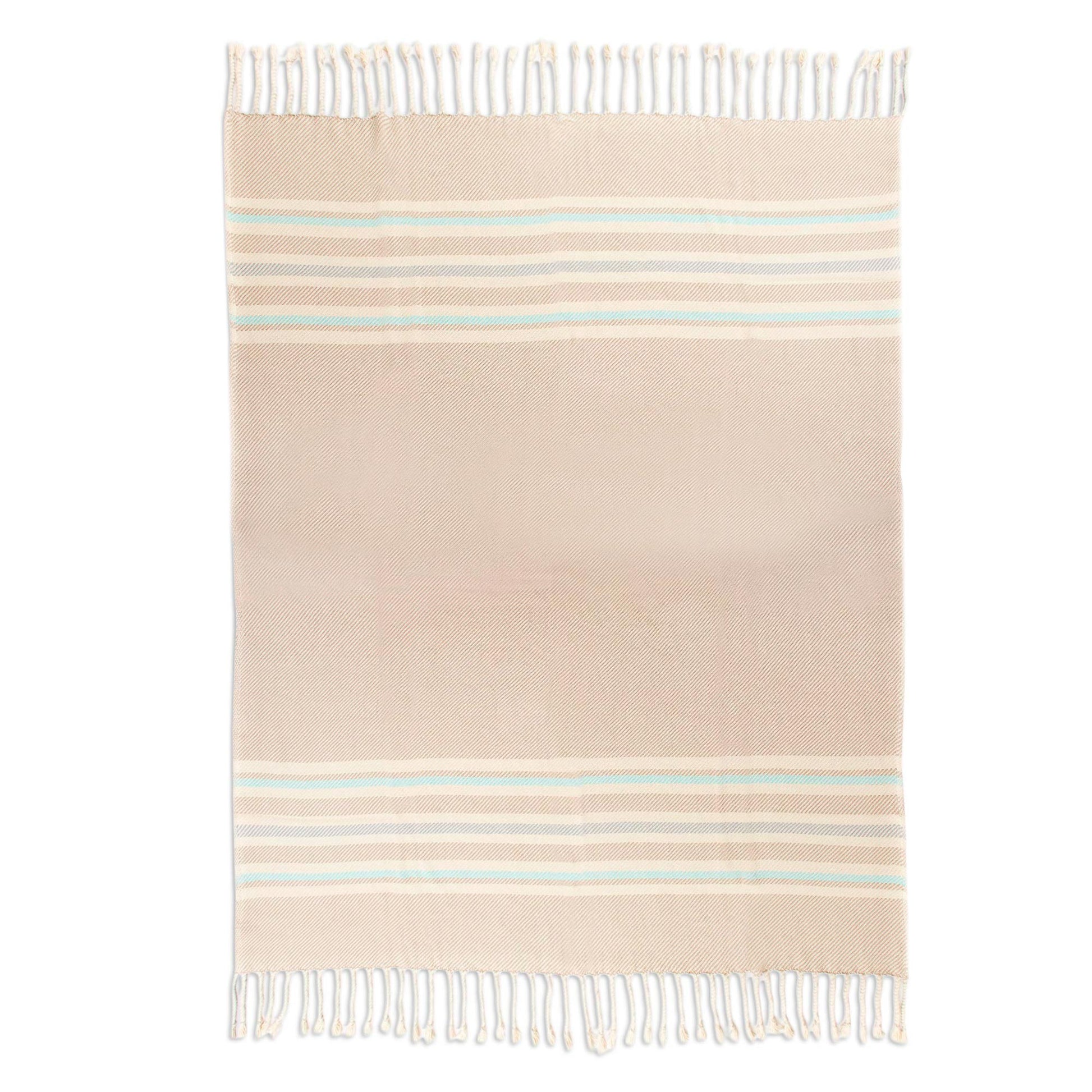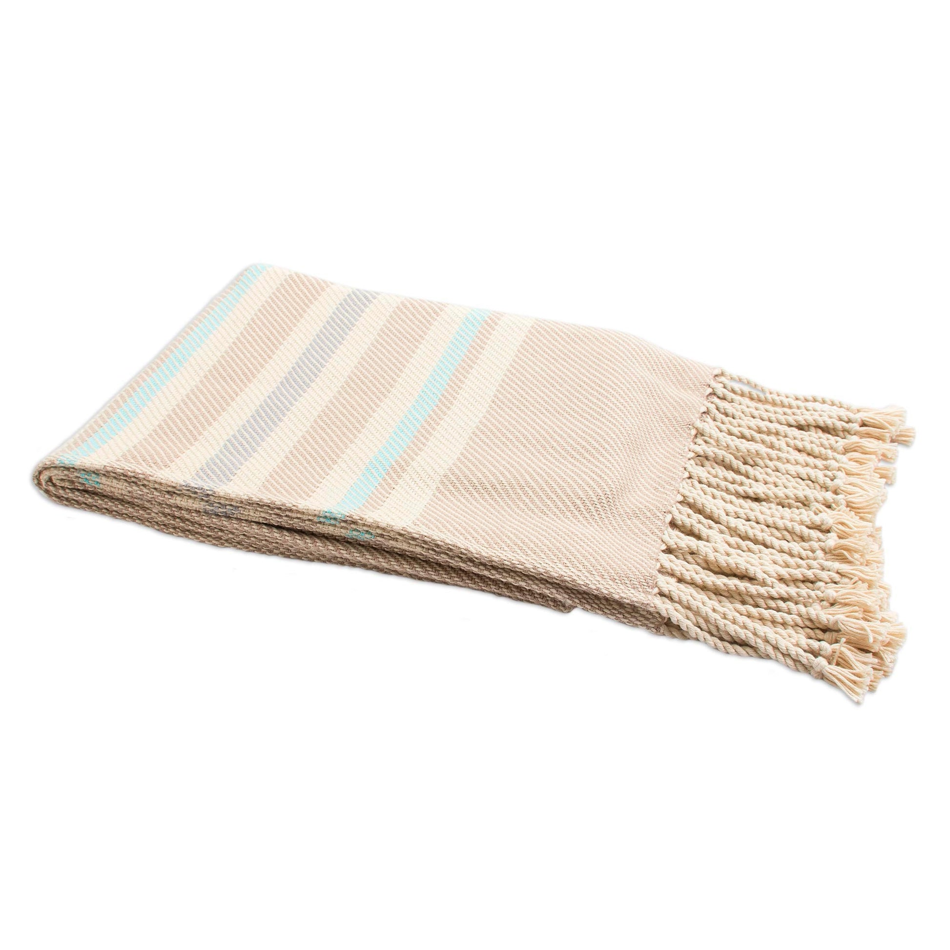 In hues of ecru, cadet blue, aqua, and alabaster, striped patterns decorate this throw from Peru. Benita Cutipa hand-weaves this throw from cotton on a traditional loom, finishing at the ends with fringes.