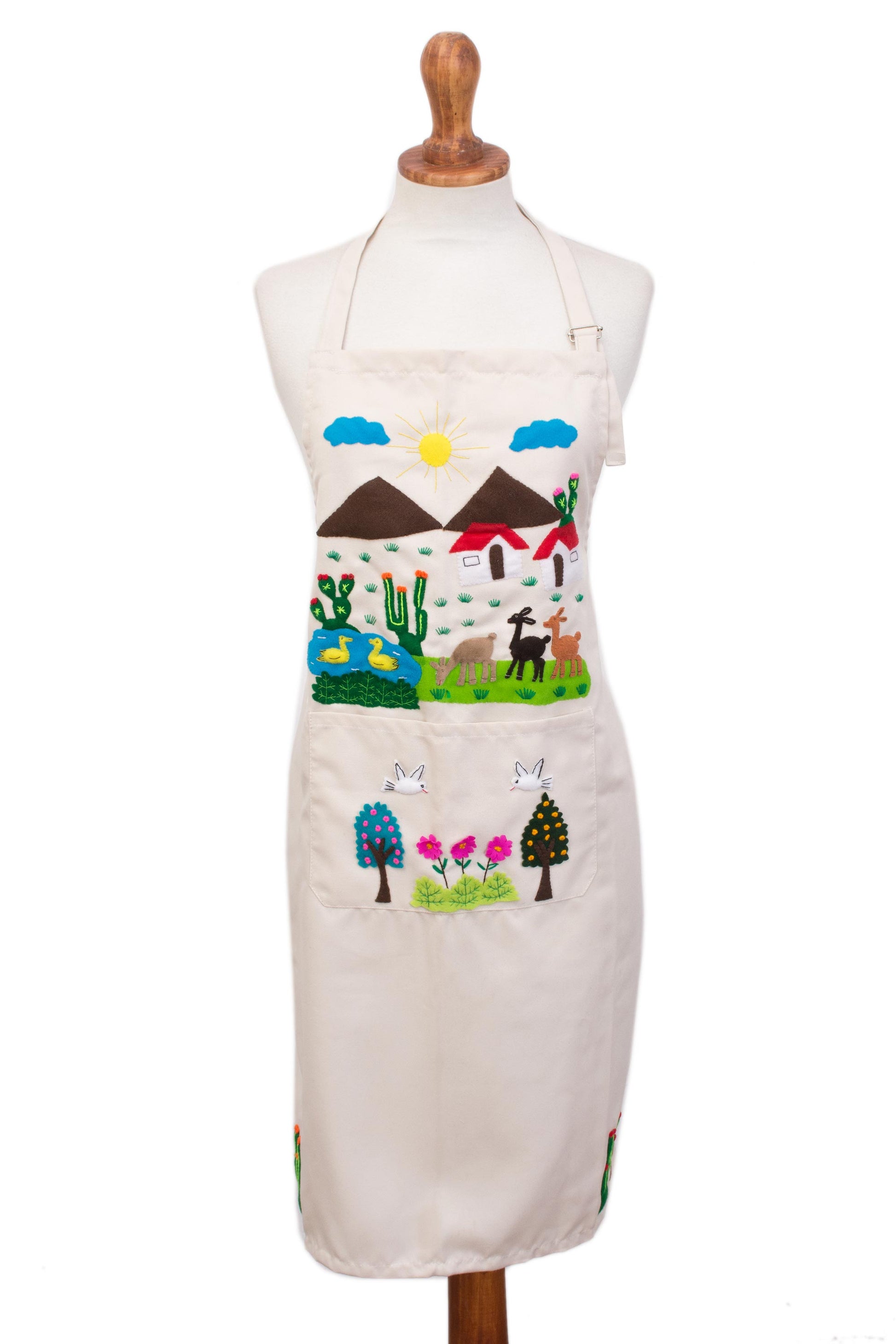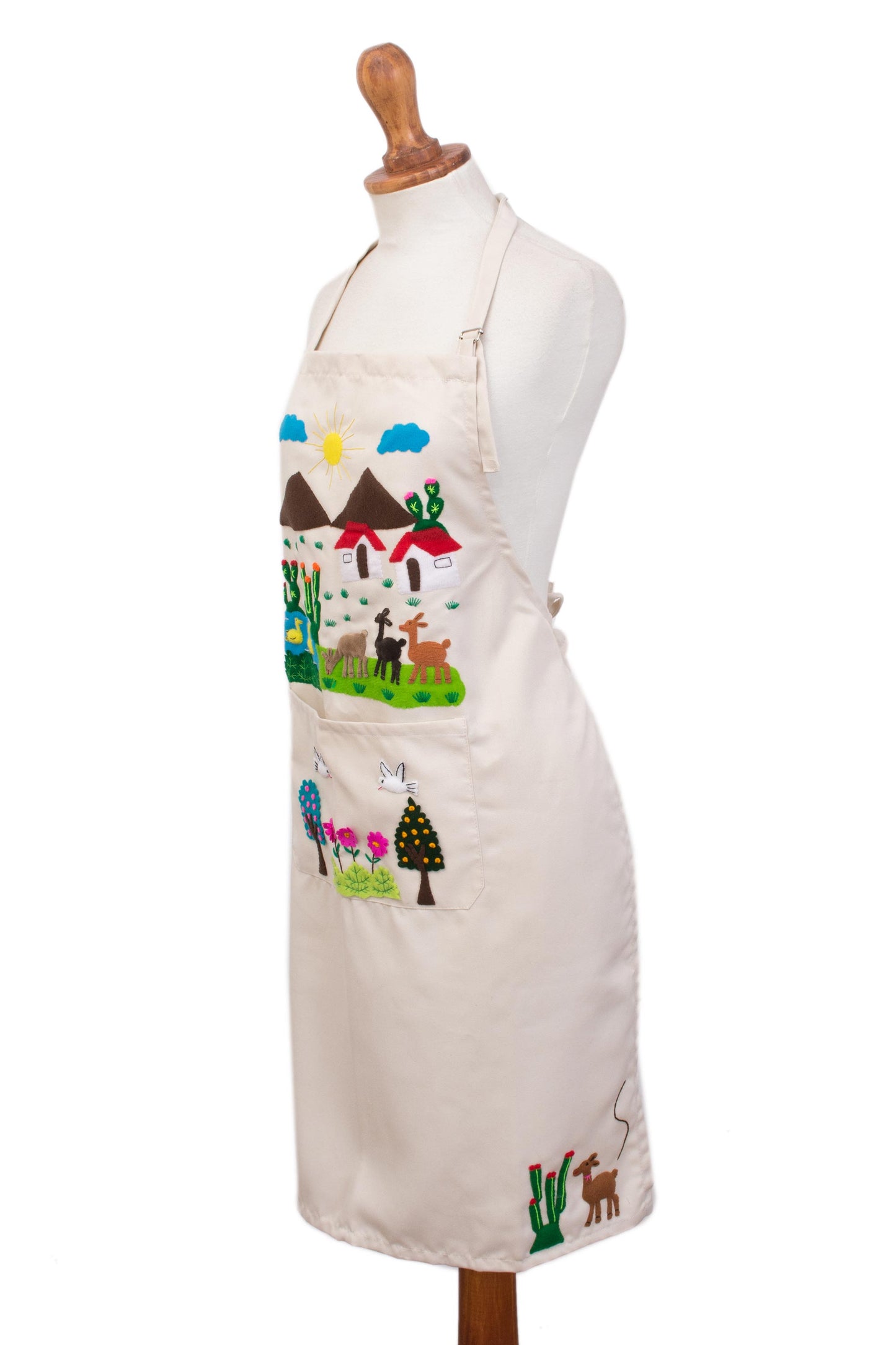 Depicting a sweet morning in the Andes, cotton blend applique in the traditional style of arpillera handicrafts decorates the front of this apron from Peru. Leonor Quispe crafts the patchwork designs by hand for a lovely kitchen accessory.