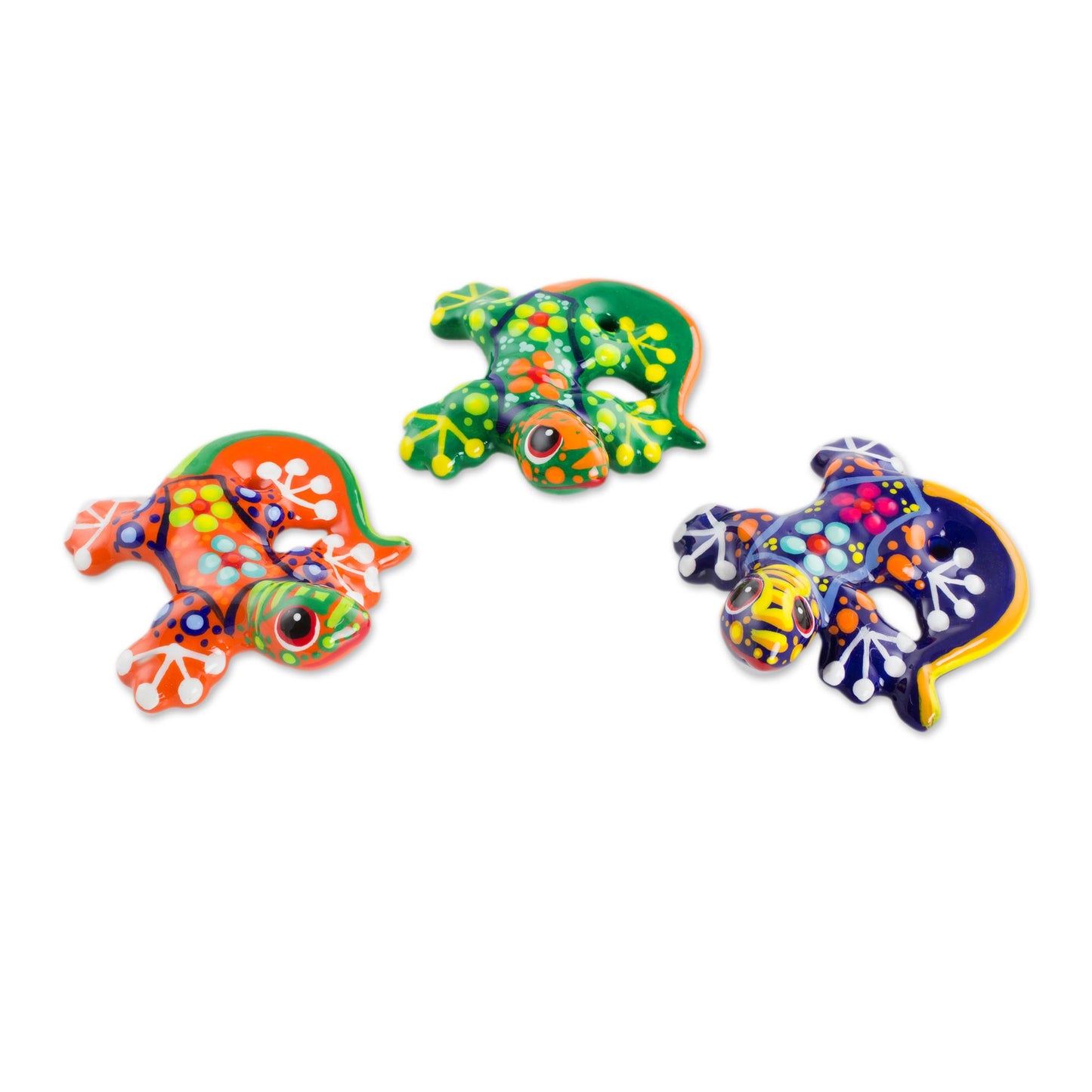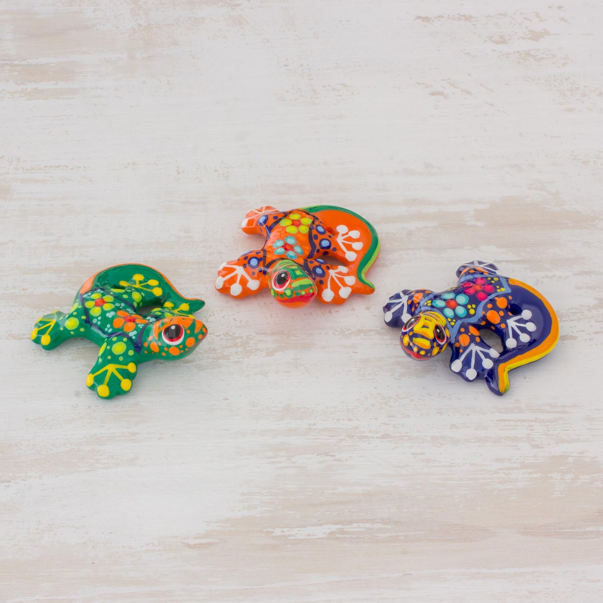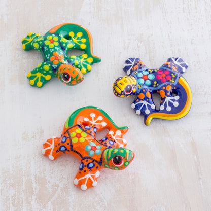 Three brightly colored ceramic salamander figurines will make a lively addition to any room. Lidia and Joaquin find inspiration in the natural beauty in Costa Rica. They hand paint the petite lizards with vivid base colors, multi-colored detailed highlights, and sweet little flowers on their backs.