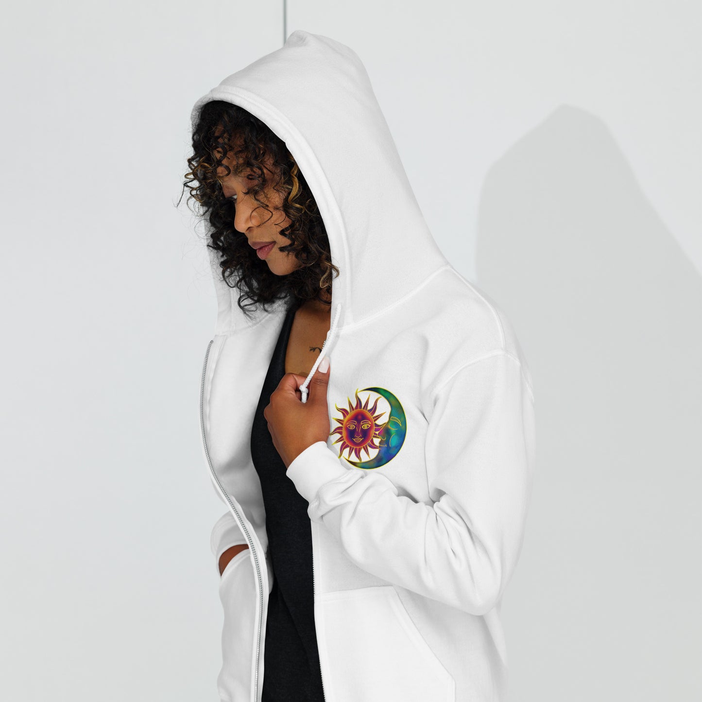 Wrap yourself in cozy celestial charm with this sun and moon zip hoodie, featuring a sweet smiling duo that brings warmth and whimsy to every outing. Made from ultra-soft fleece inside and out, it delivers everyday comfort perfect for nature lovers and starry-eyed dreamers alike. The sturdy metal zipper, roomy pockets, and color-matched drawstrings add practical style to this must-have layer. Whether you're on a peaceful walk or curled up at home, this celestial-inspired hoodie keeps you cozy, and cute.