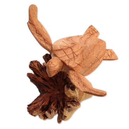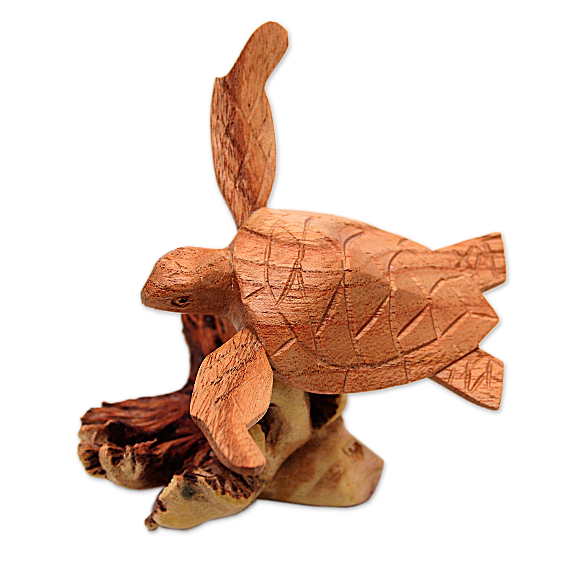 Displayed atop a benalu wood fragment, a majestic sea turtle swims through ocean waters. Balinese artisan Yudi Suardi diligently hand-carves this sea turtle figurine from jempinis wood that displays a beautiful natural grain.