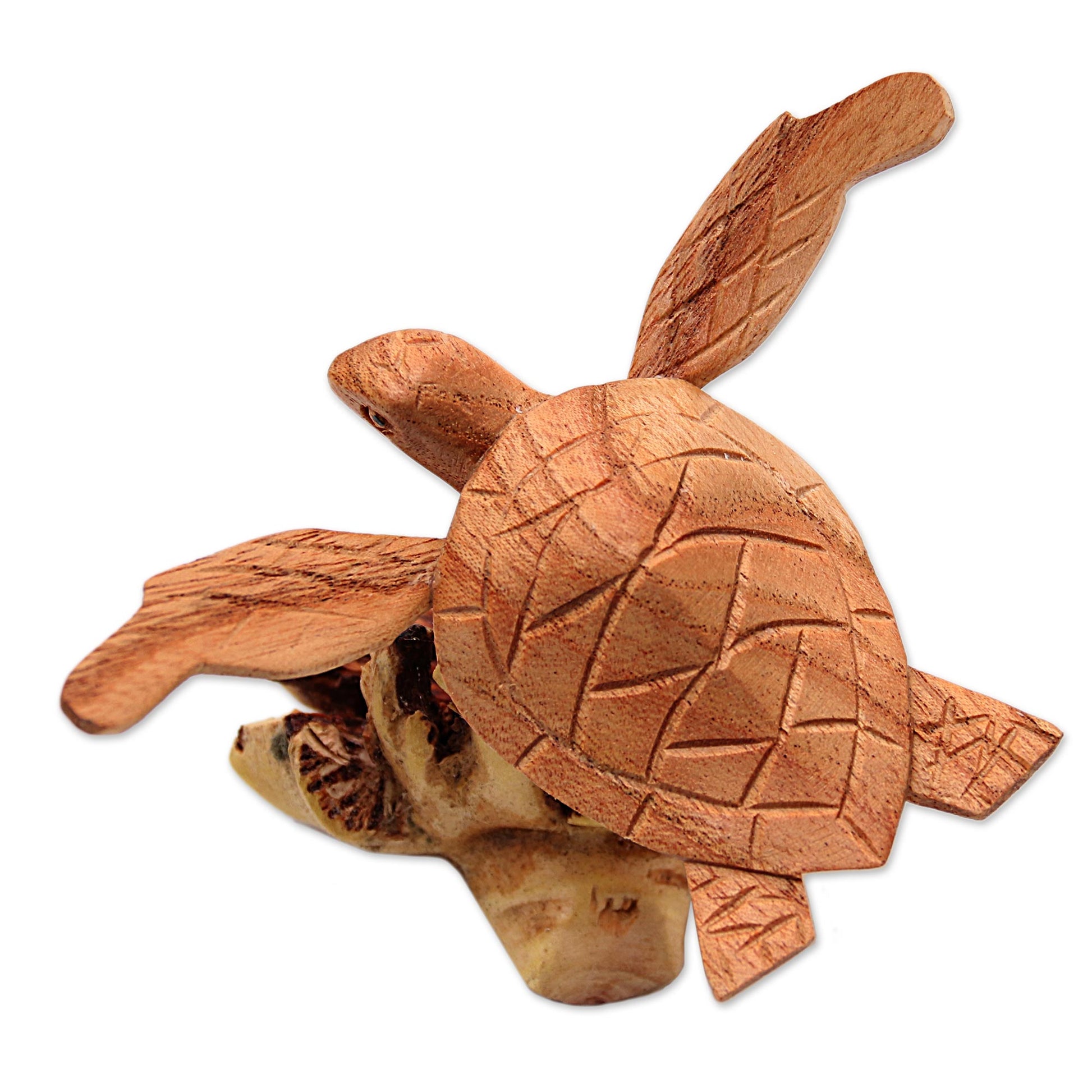 Swimming Turtle Jempinis and Benalu Wood Sea Turtle Figurine from Bali