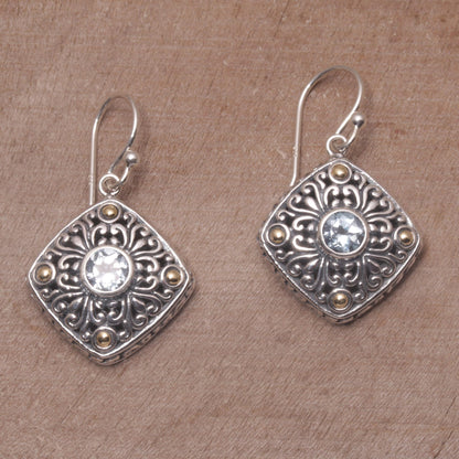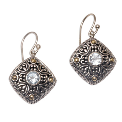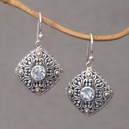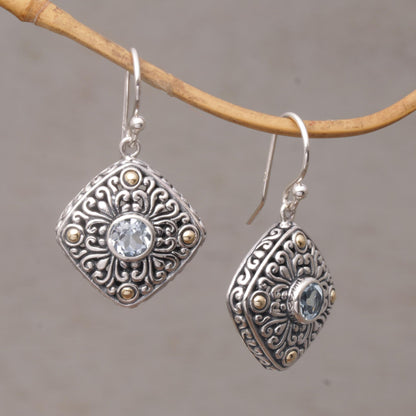 Shining openwork swirl motifs decorate these Balinese dangle earrings, crafted of sterling silver by local artisans. They detail the corners with 18k gold, surrounding one carat of blue topaz stones in the centers. Accentuating any outfit, these earrings are presented by Kadek Wijanegara.