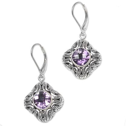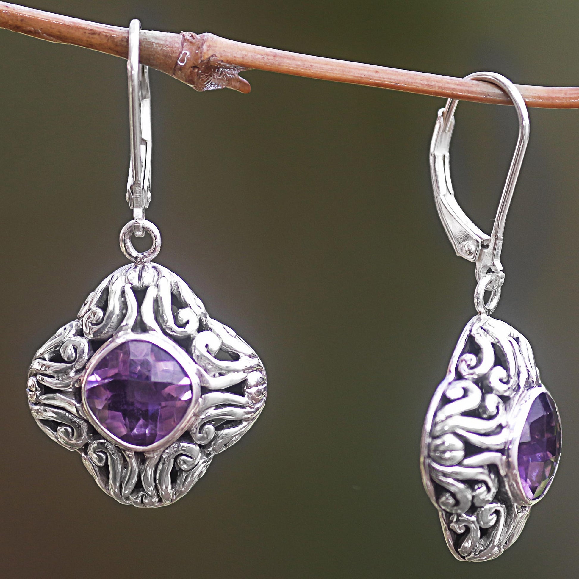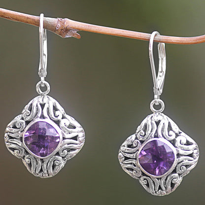 Dazzling faceted amethysts with a total weight of three carats captivate the eye in this pair of dangle earrings by artisan Made Sudiari of Indonesia. Each flower-shaped earring is handcrafted from sterling silver and intricately engraved with swirl motifs.