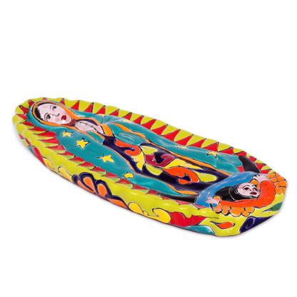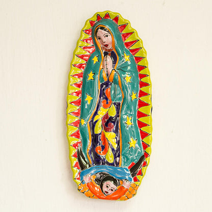 Known as the Virgin of Guadalupe, this depiction of mother Mary from the Bible depicts the celestial virgin with her hands held together in prayer as she wears a starry gown, framed by green and orange. Mexican artisan Juana Ponce creates this reverent wall sculpture, which is crafted from ceramic and painted by hand with colorful pigments in the style of Talavera handicrafts.