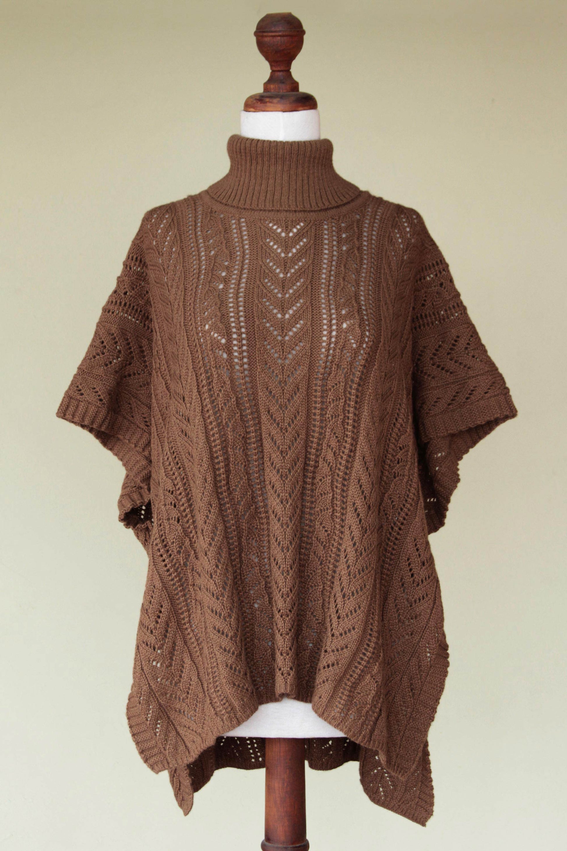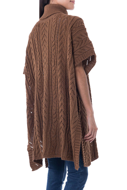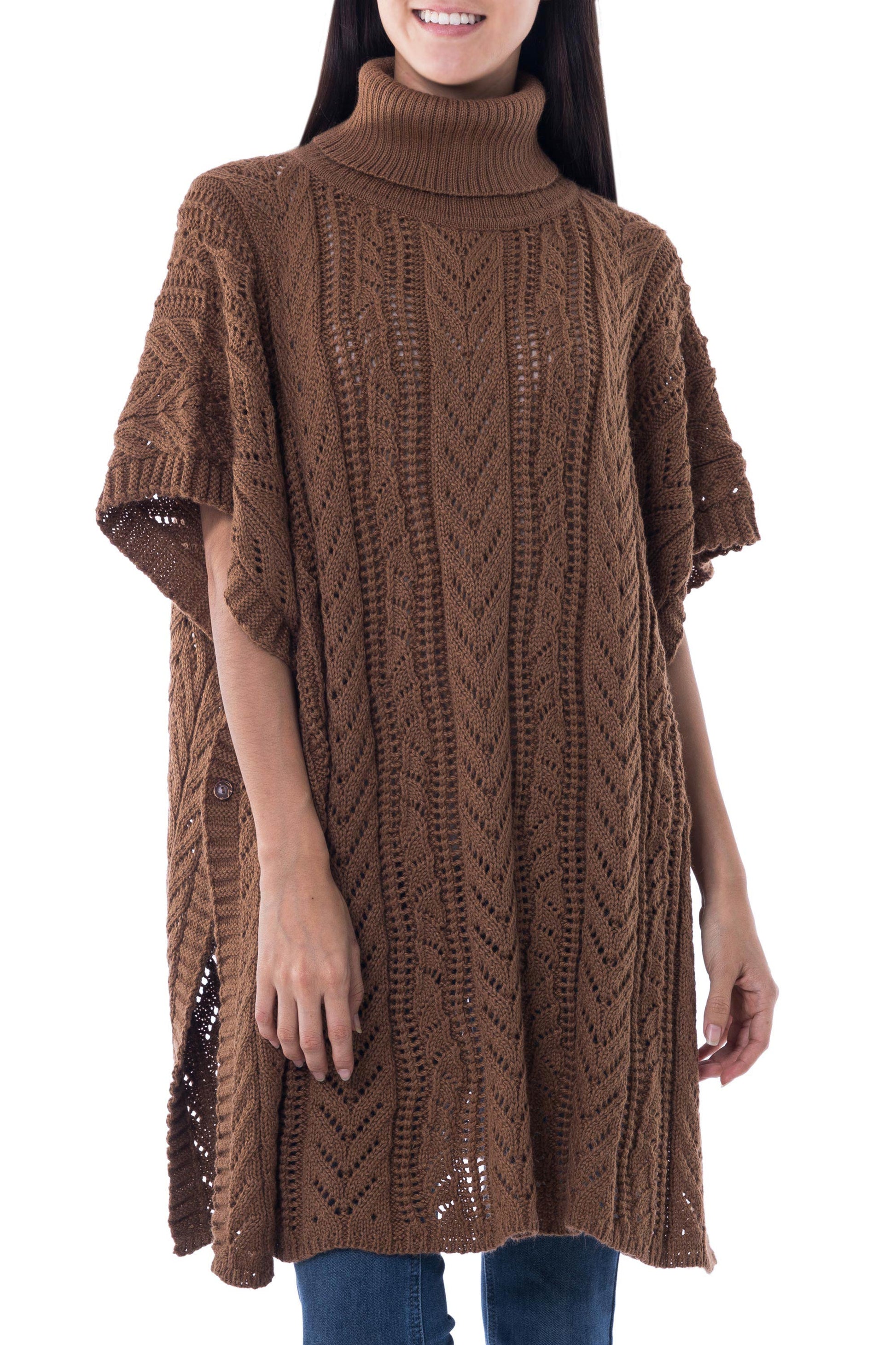 Alfredo Falcon designs this smooth tan brown poncho sweater with feminine elegance in mind. It is knitted with a soft alpaca wool blend featuring a cowl neck. The poncho has a flirty fall and two coconut shell buttons under the arms.