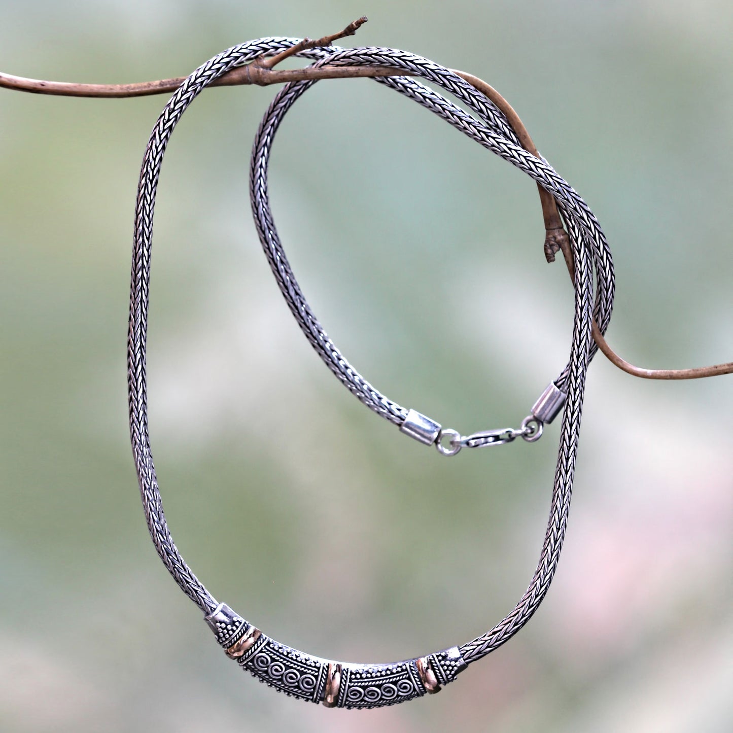 Rich in classic Balinese artistry, is the design of this sterling silver necklace. From Putu Putri in Bali, the sterling silver necklace is crafted by hand featuring oxidized contrasts and accents in 18k gold plate.