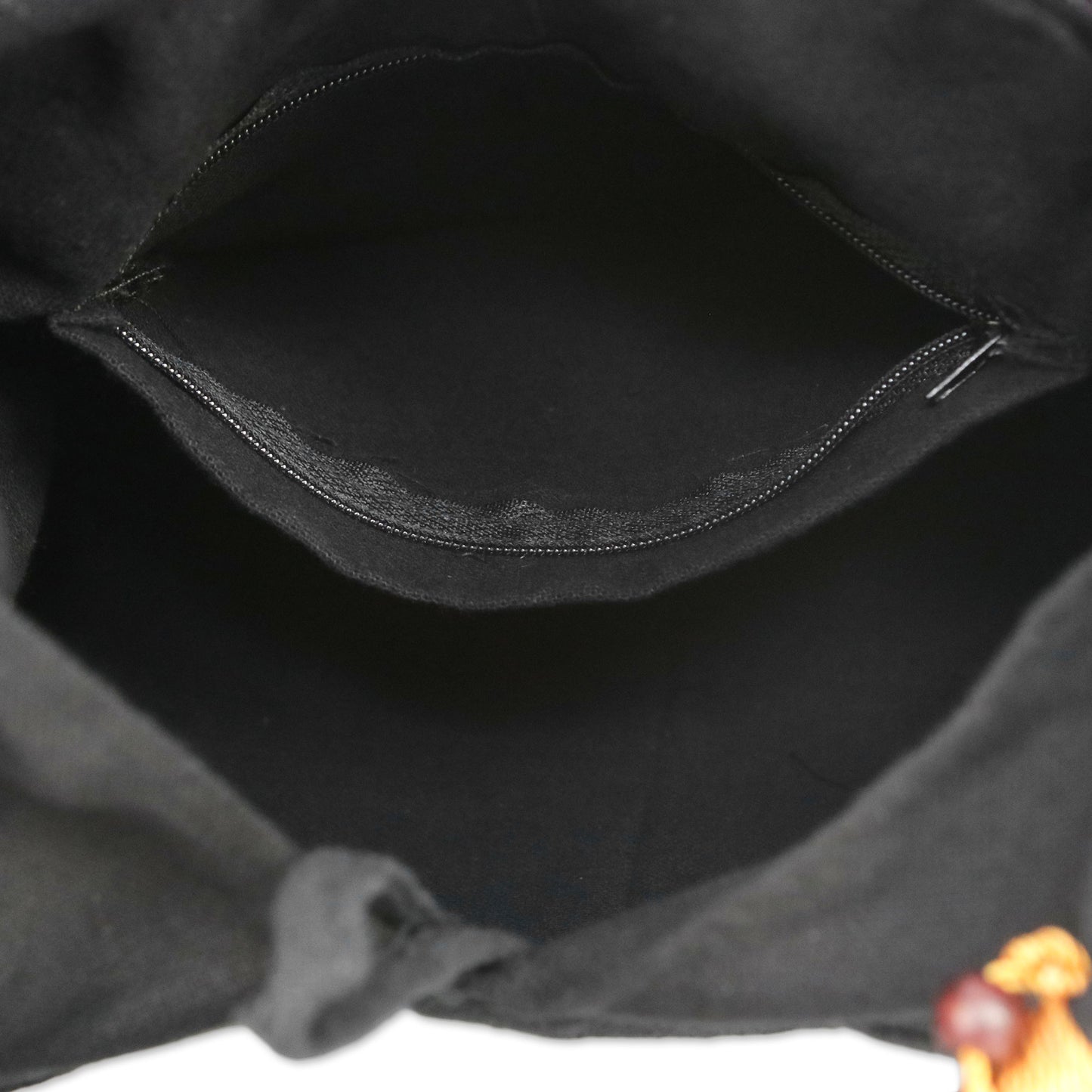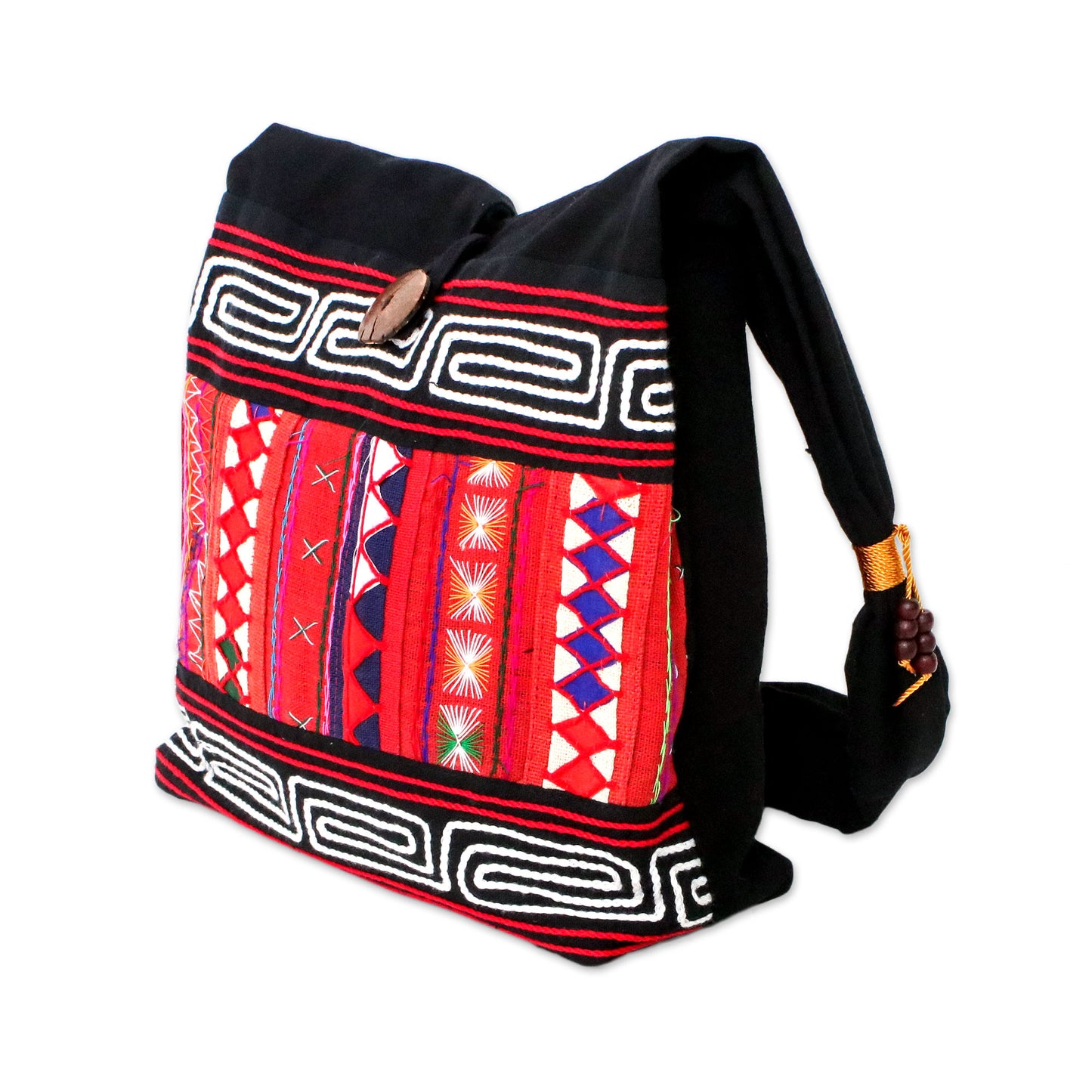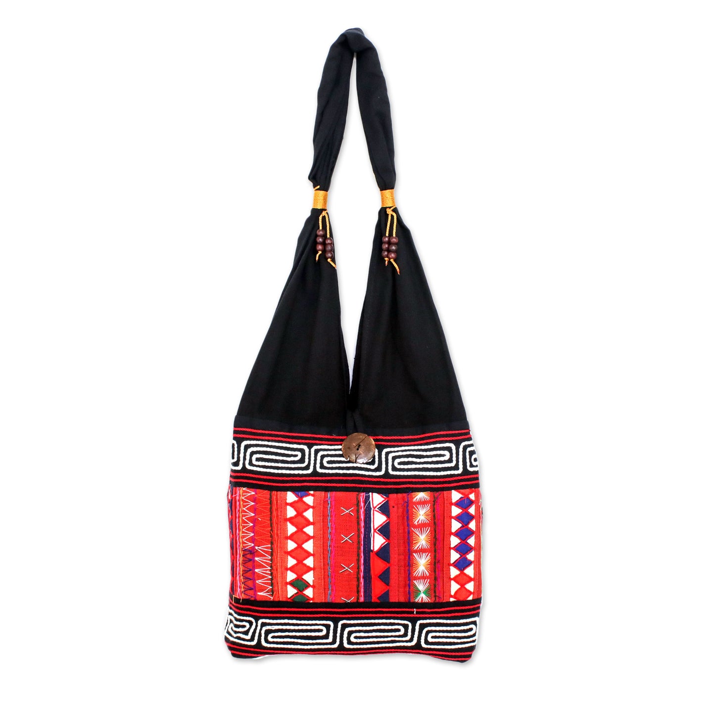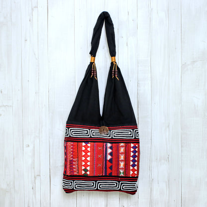Thai artisan Jiap Rojjana creates this beautiful shoulder bag inspired by the vivid geometric designs of the Akha Hill Tribe. The eye-catching patterns in colorful shades of red, orange, blue, and white are embroidered by hand on the front of the black cotton bag. Golden yellow cord and rain tree wood beads decorate the strap, with a coconut shell button for the closure. The shoulder bag opens to reveal a black cotton lining with an interior zipper pocket that is ideal for smaller items.