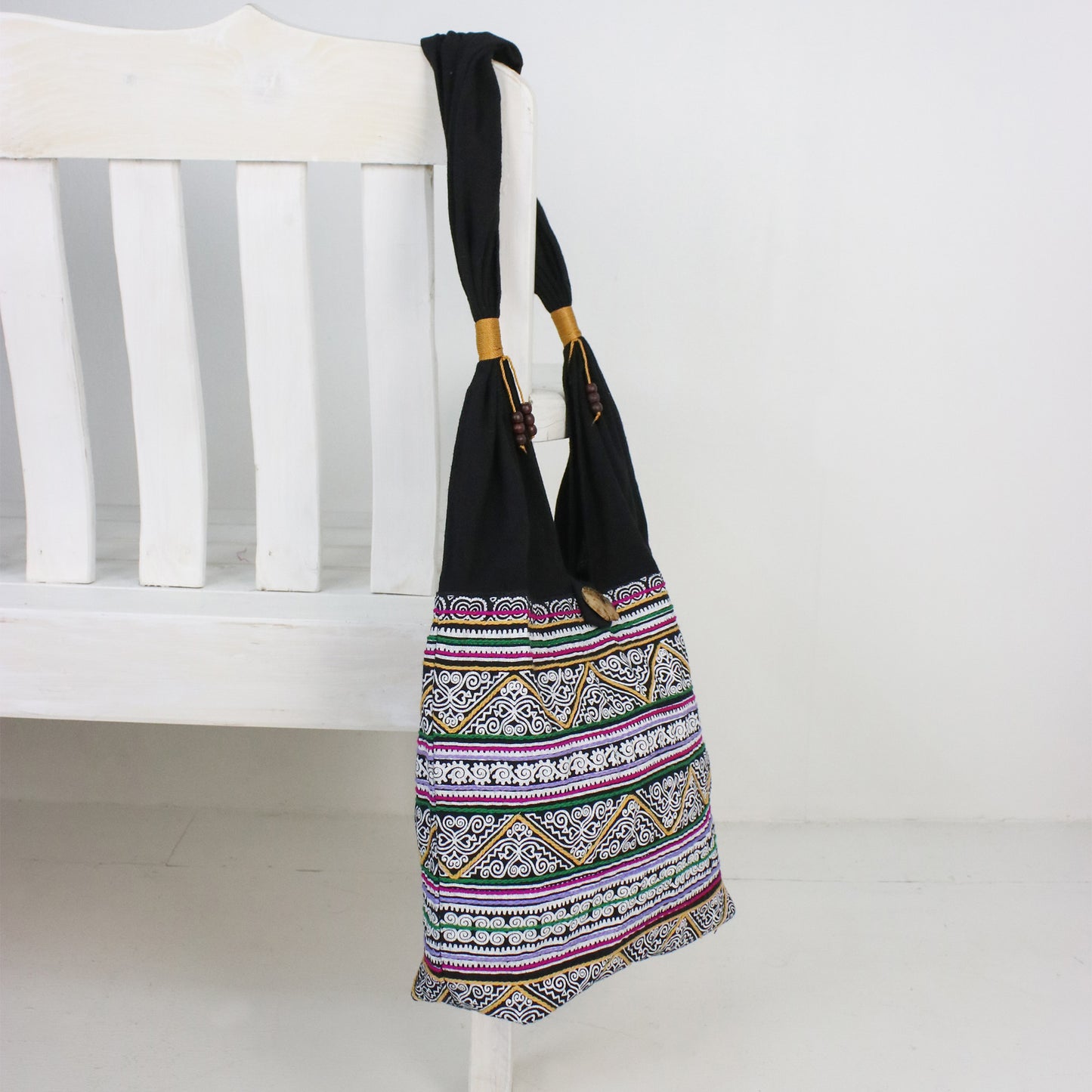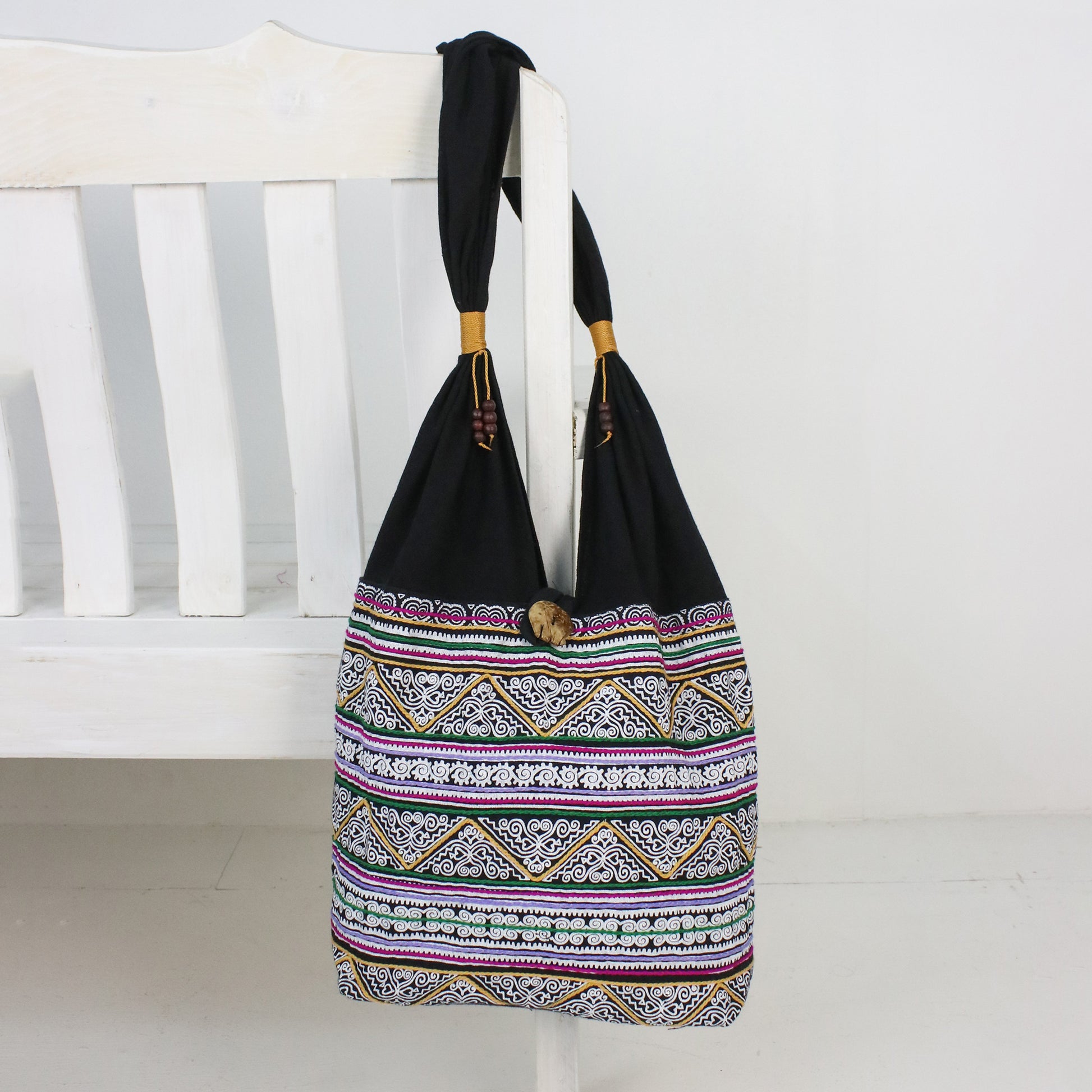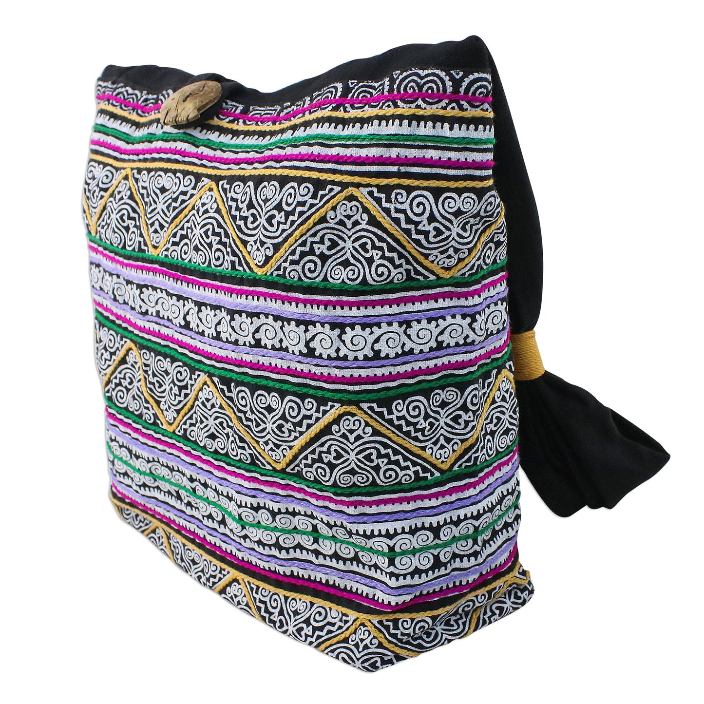Decorated with white spiral motifs among multicolored embroidery, this fantastic cotton shoulder bag is designed by Thailand's Jiap Rojjana. The bag is accentuated with wood beads and golden cords at the strap, opening with a coconut shell button. A cotton lining with an inner zipper pocket completes the bag.