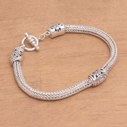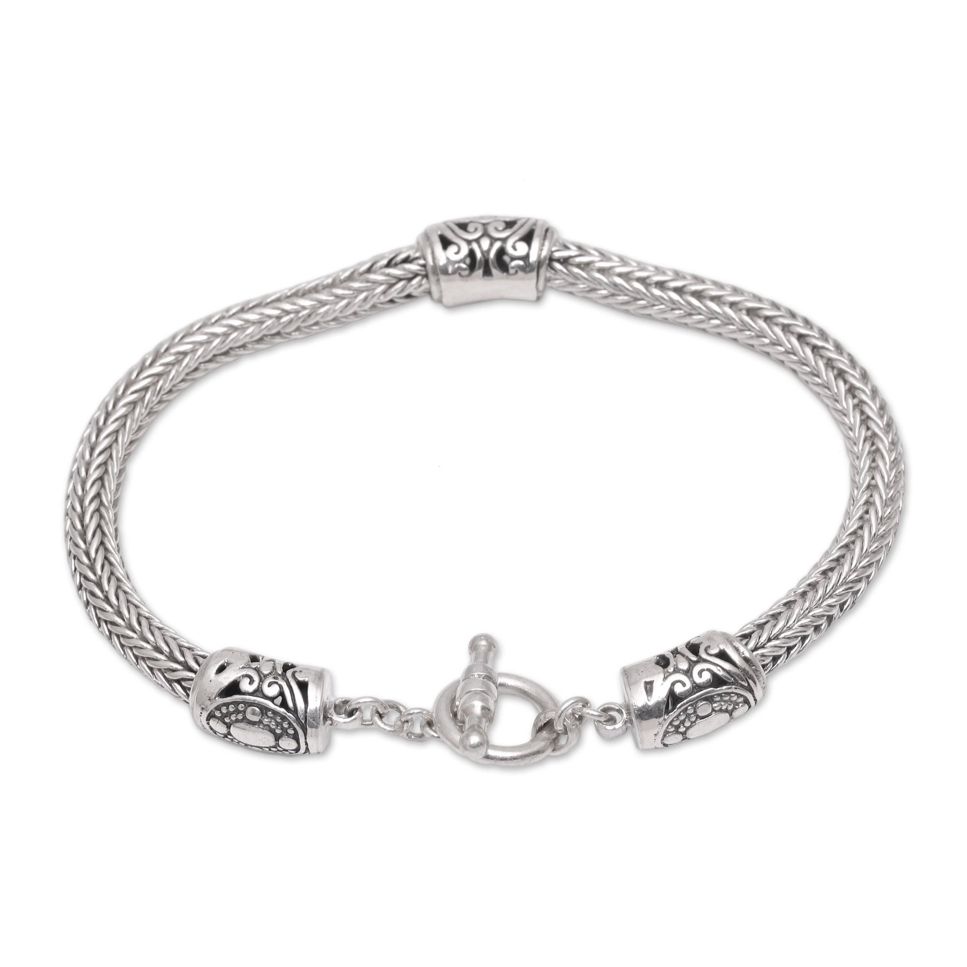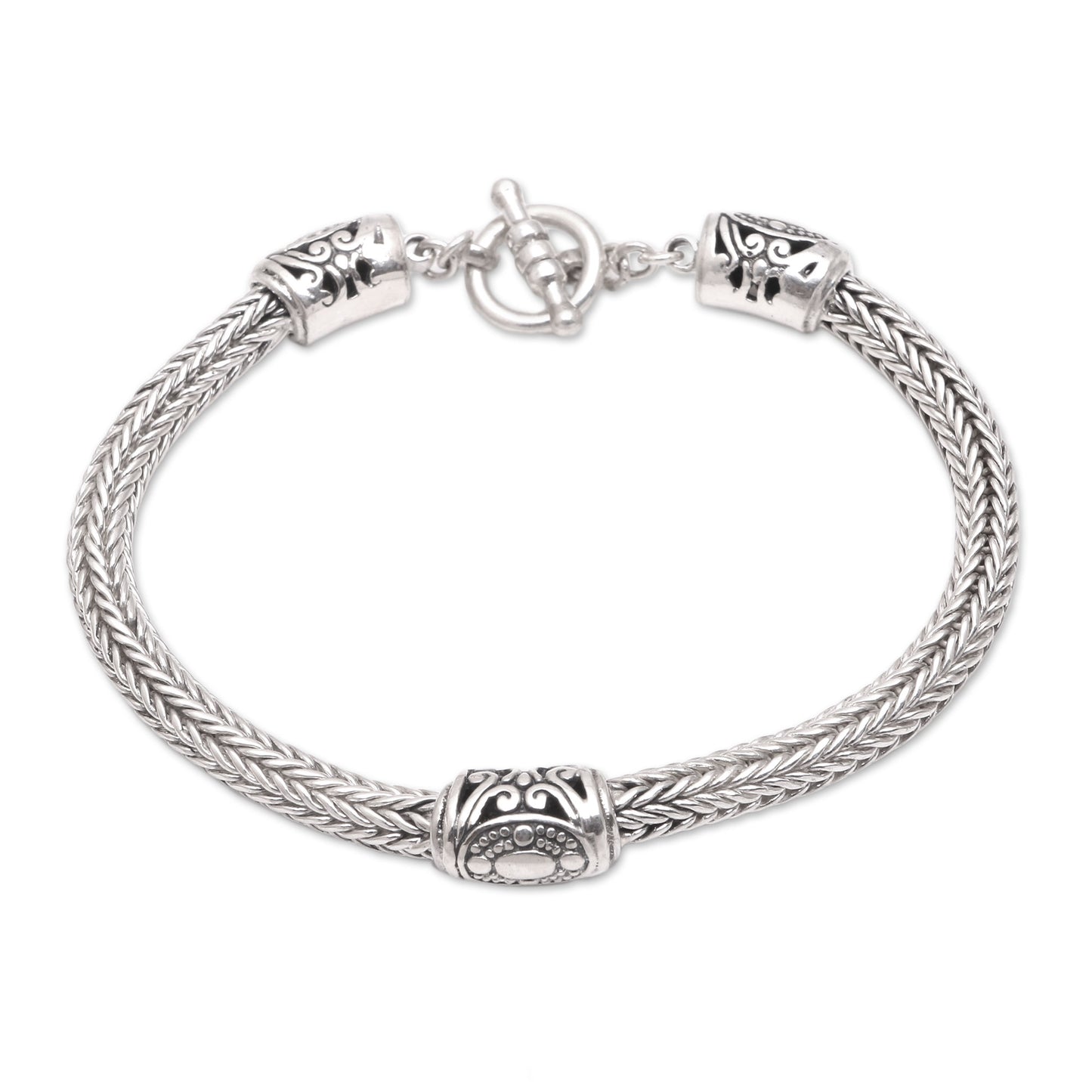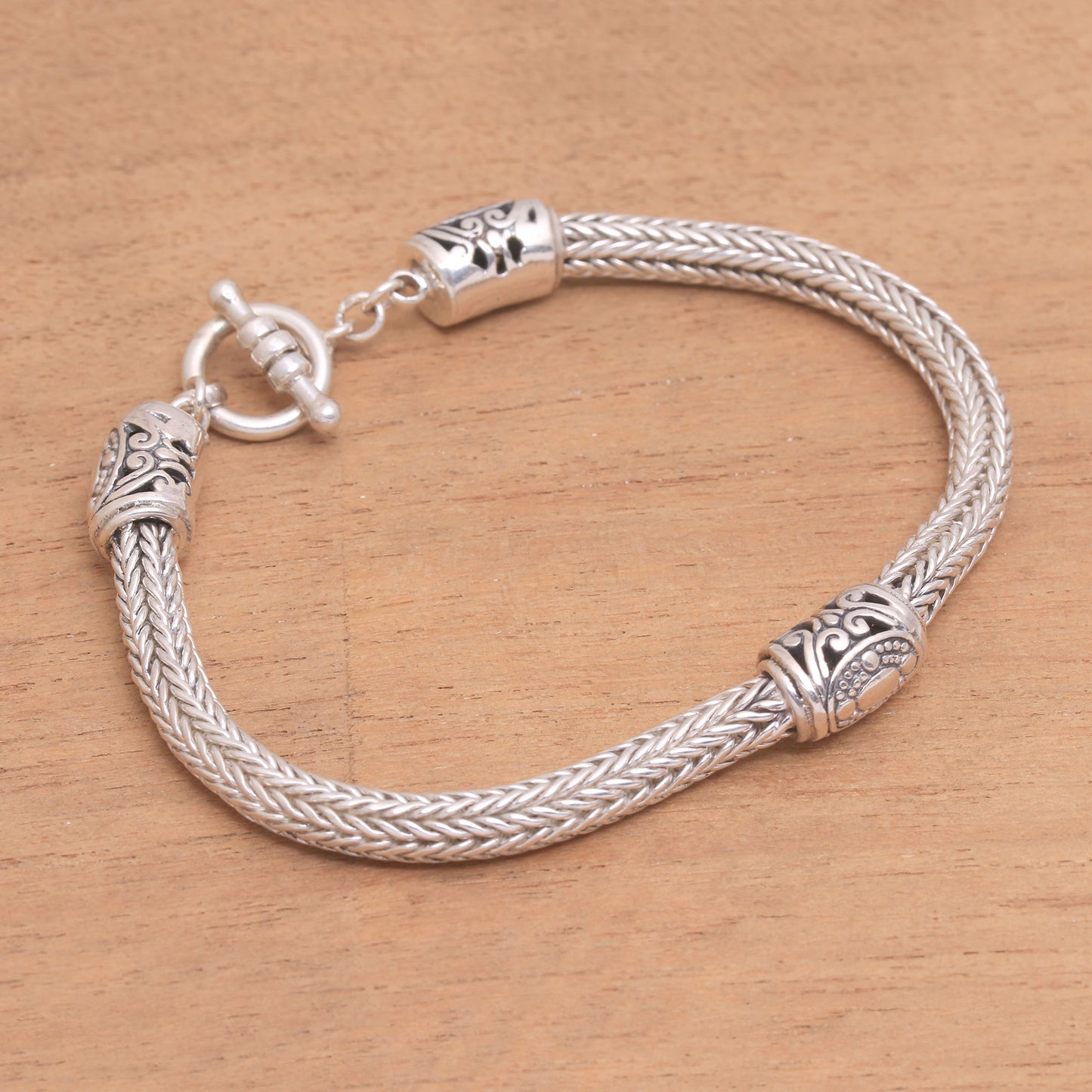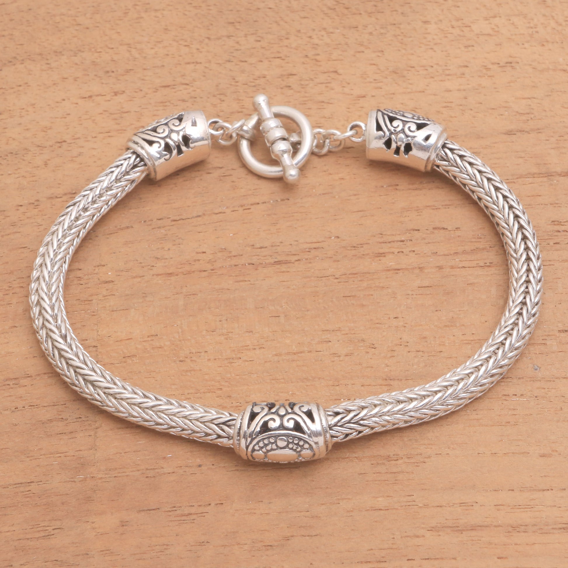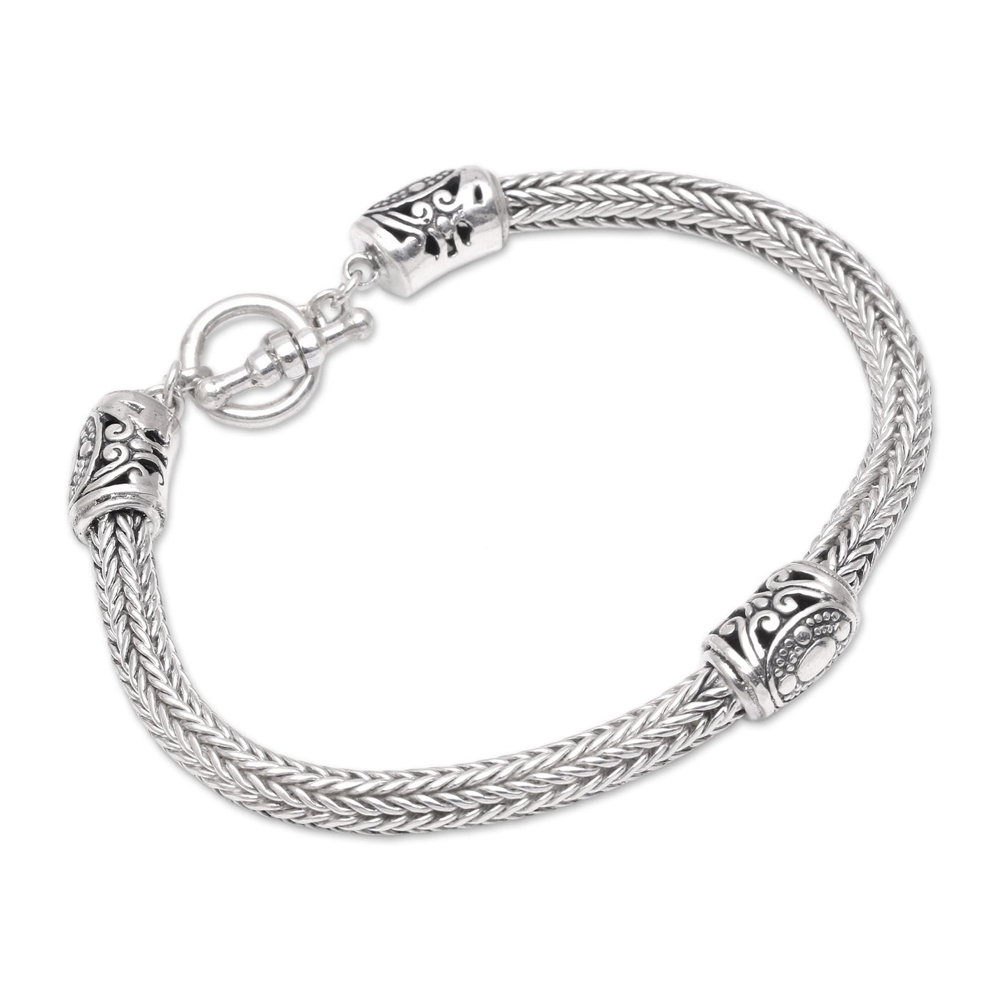 Crafted of sterling silver, three pendants with beautiful scrollwork decorate this bracelet from Bali. Wayan Asmana presents this accessory, which circles the wrist with sterling Naga chain.
