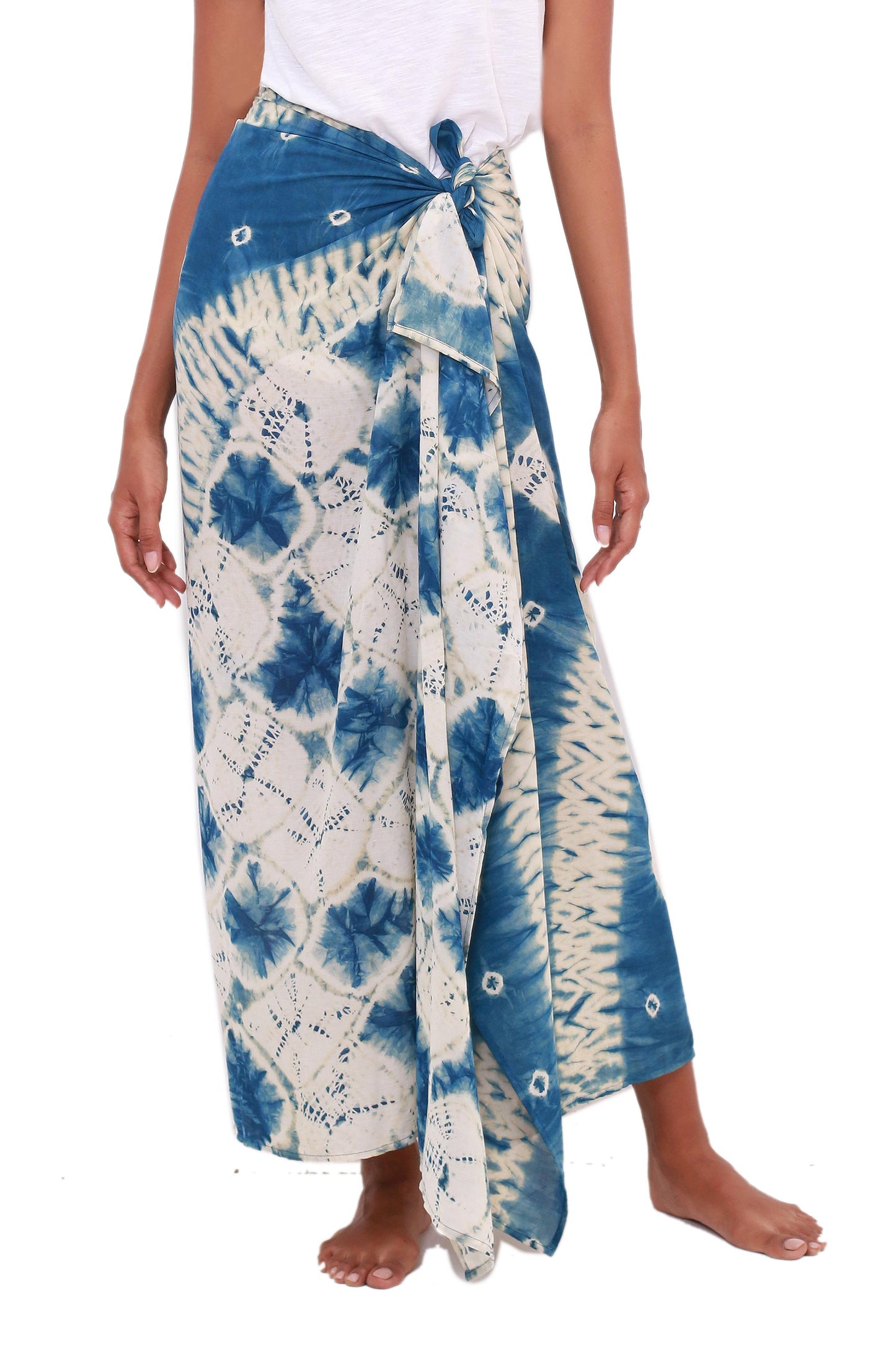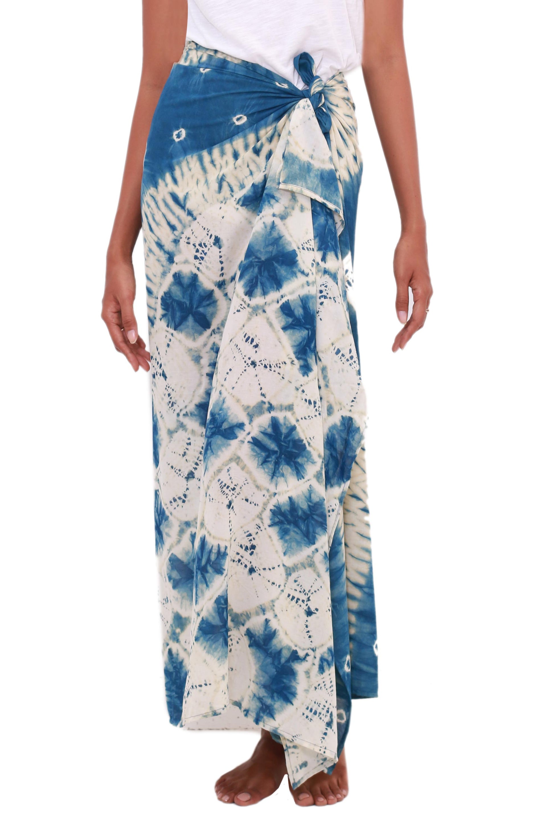 Inspired by the ocean waters, this blissful sarong is named Toya Segara in Javanese. Tiwi creates the rayon sarong, which features lovely tie-dyed waves and square motifs in indigo and eggshell.