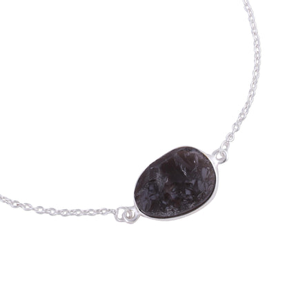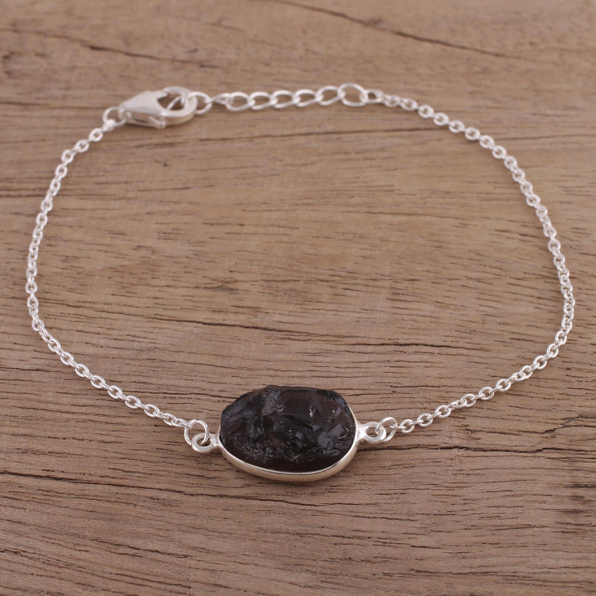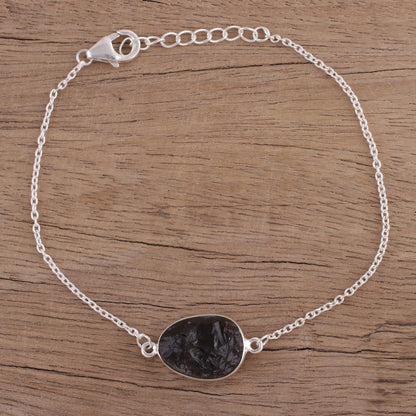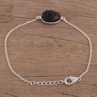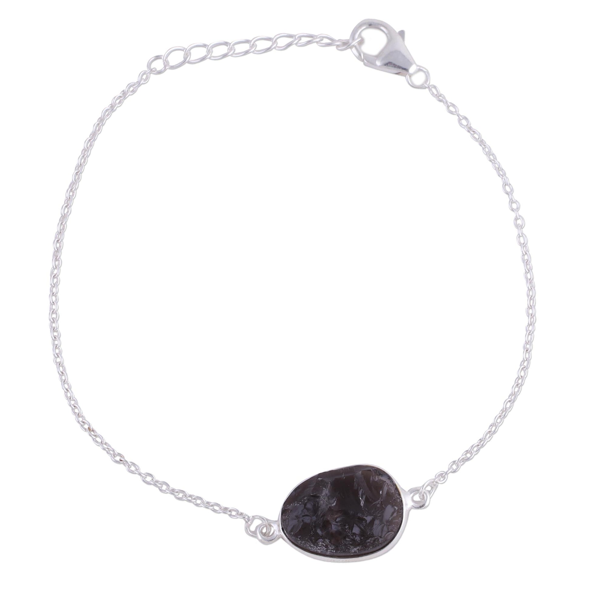 Neetu Barathi designs a trendy bracelet from India. Crafted of sterling silver, it circles the wrist with an adjustable length of cable chain, centered by an unfaceted egg-shaped pendant of uplifting smoky quartz gemstone.
