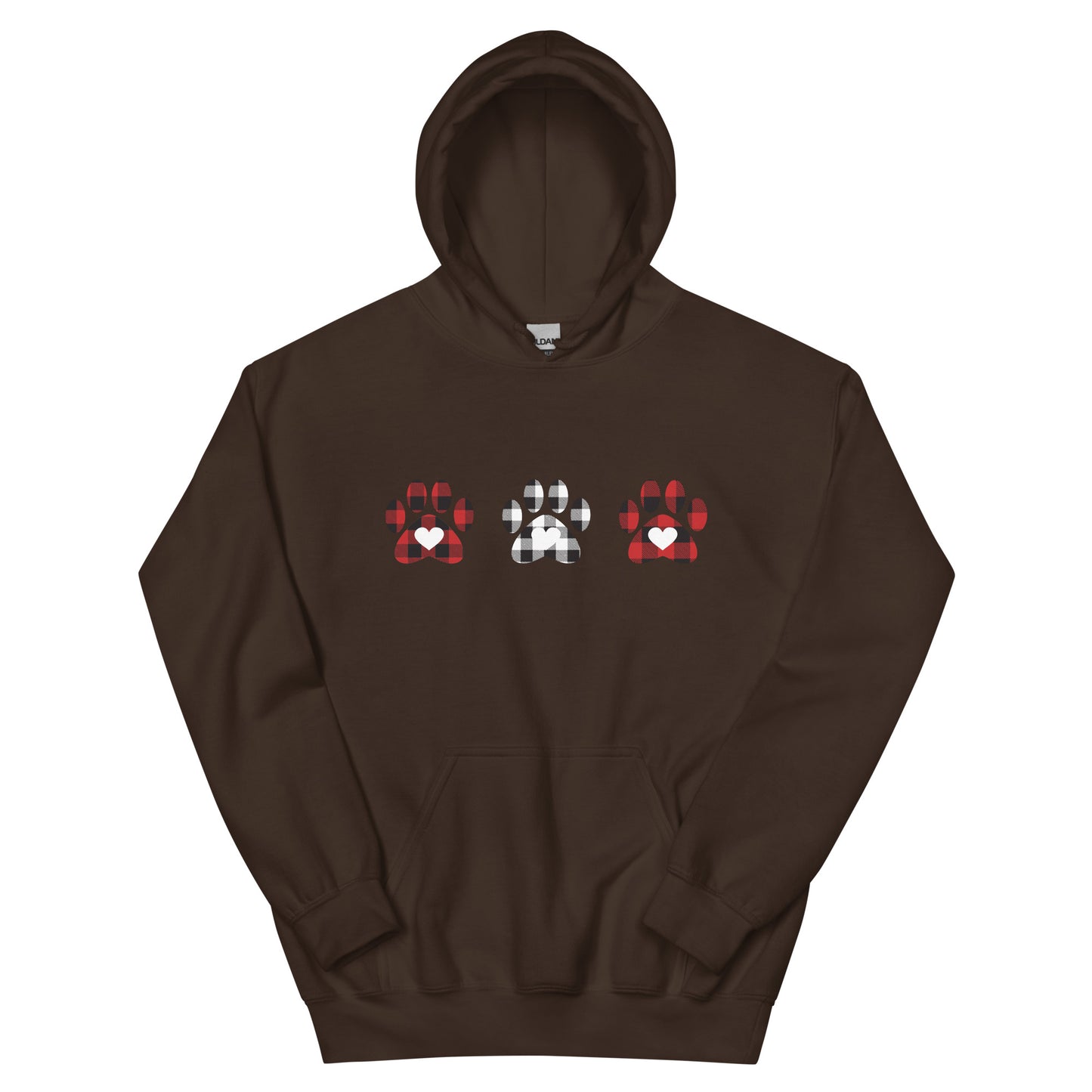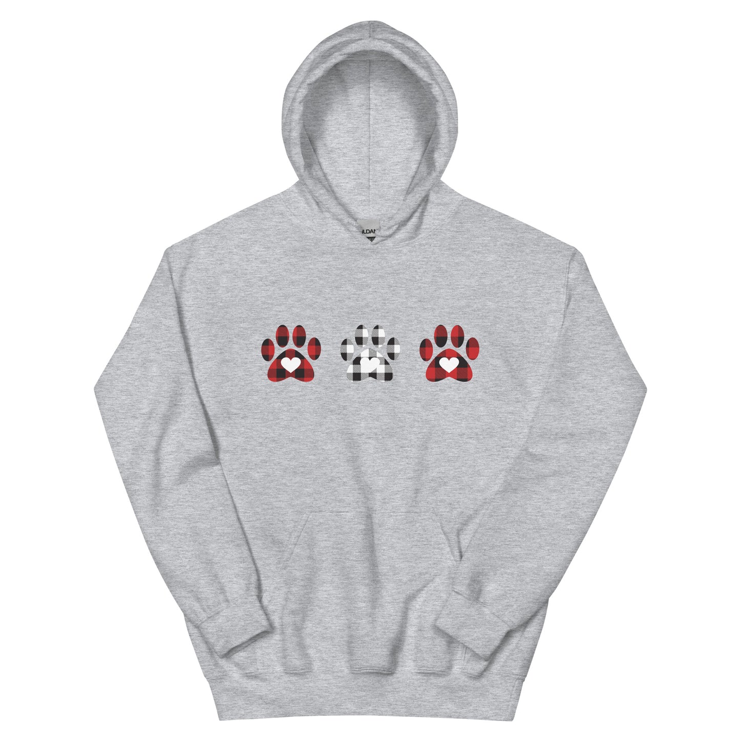 Three fun gingham heart filled paw prints show off your love for your furry friends. This hooded sweatshirt is perfect for any animal lover who also loves autumn.