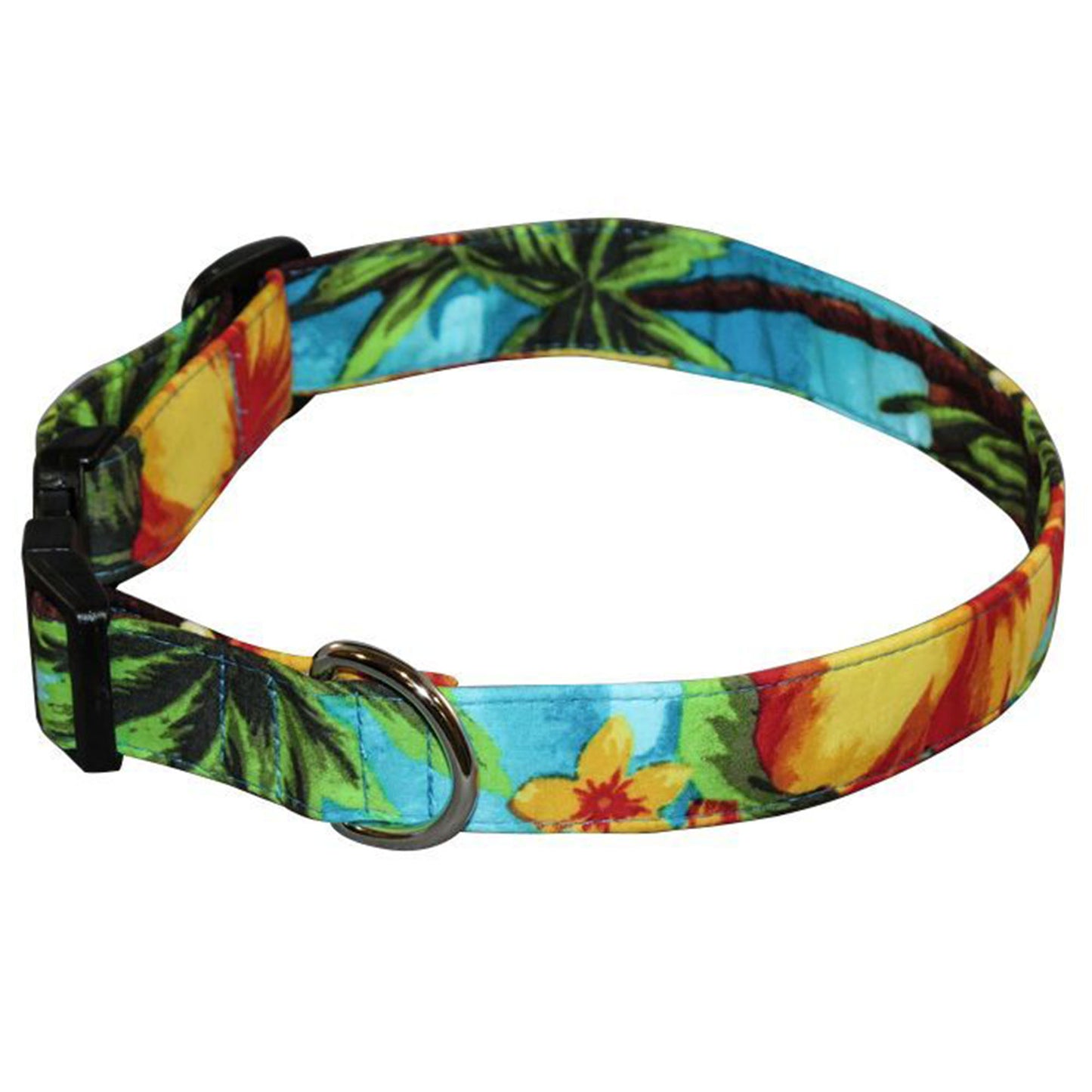 Palm trees and tropical flowers decorate this fun cat collar. Elmo's Closet pet collars are soft, strong and stylish. They are available in a great variety of fun and novel prints. The outside of the collar is covered in naturally hypoallergenic 100% cotton. This keeps pet fur from matting and breaking as well as significantly reduces skin irritation.