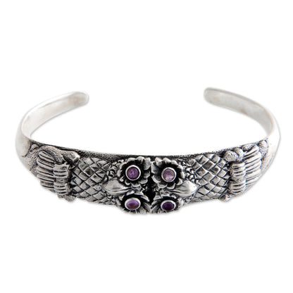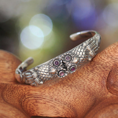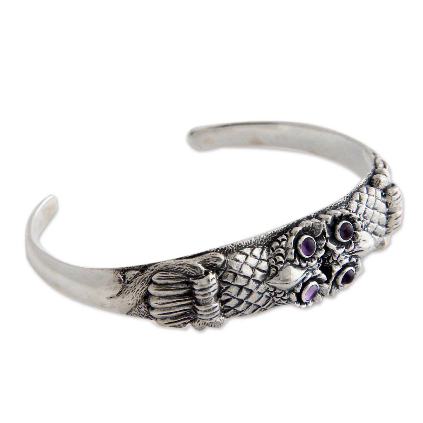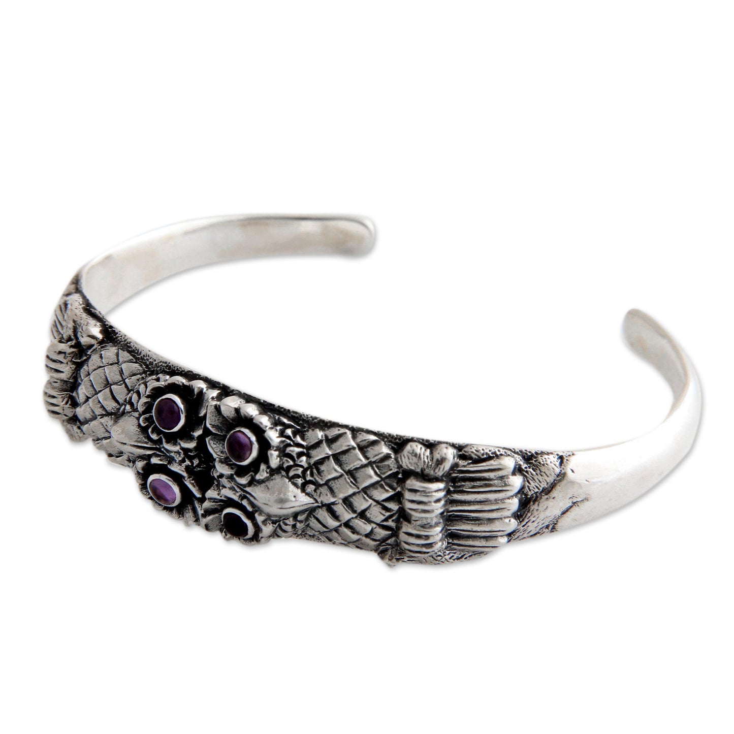 Twin Owls Sterling Silver and Amethyst Cuff Bracelet