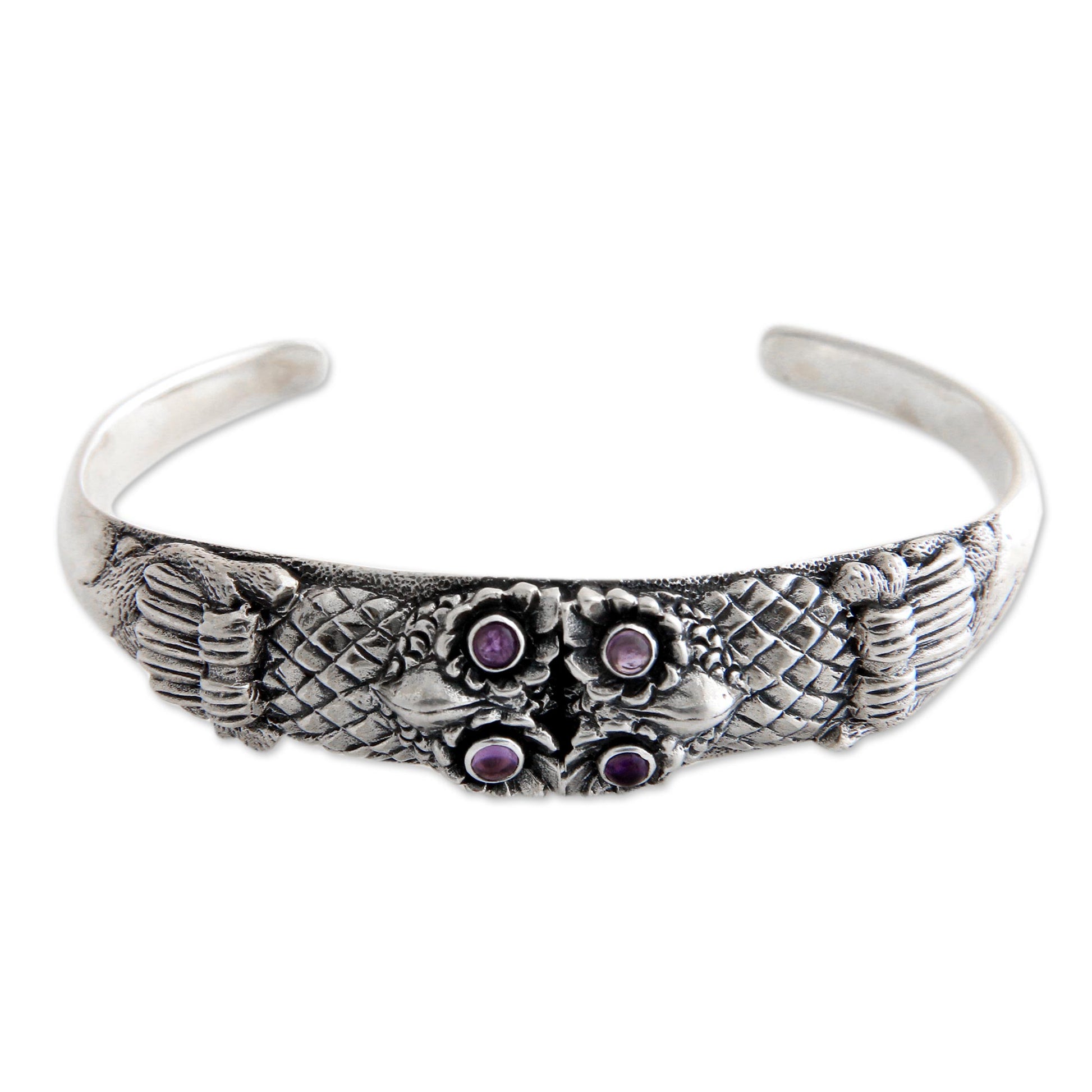 Nyoman Rena selects sterling silver to create a superbly detailed bracelet centered by charming owl twins. Lilac amethyst accentuates their watchful eyes.