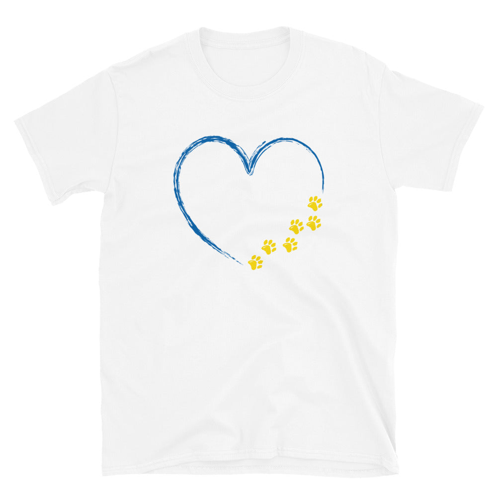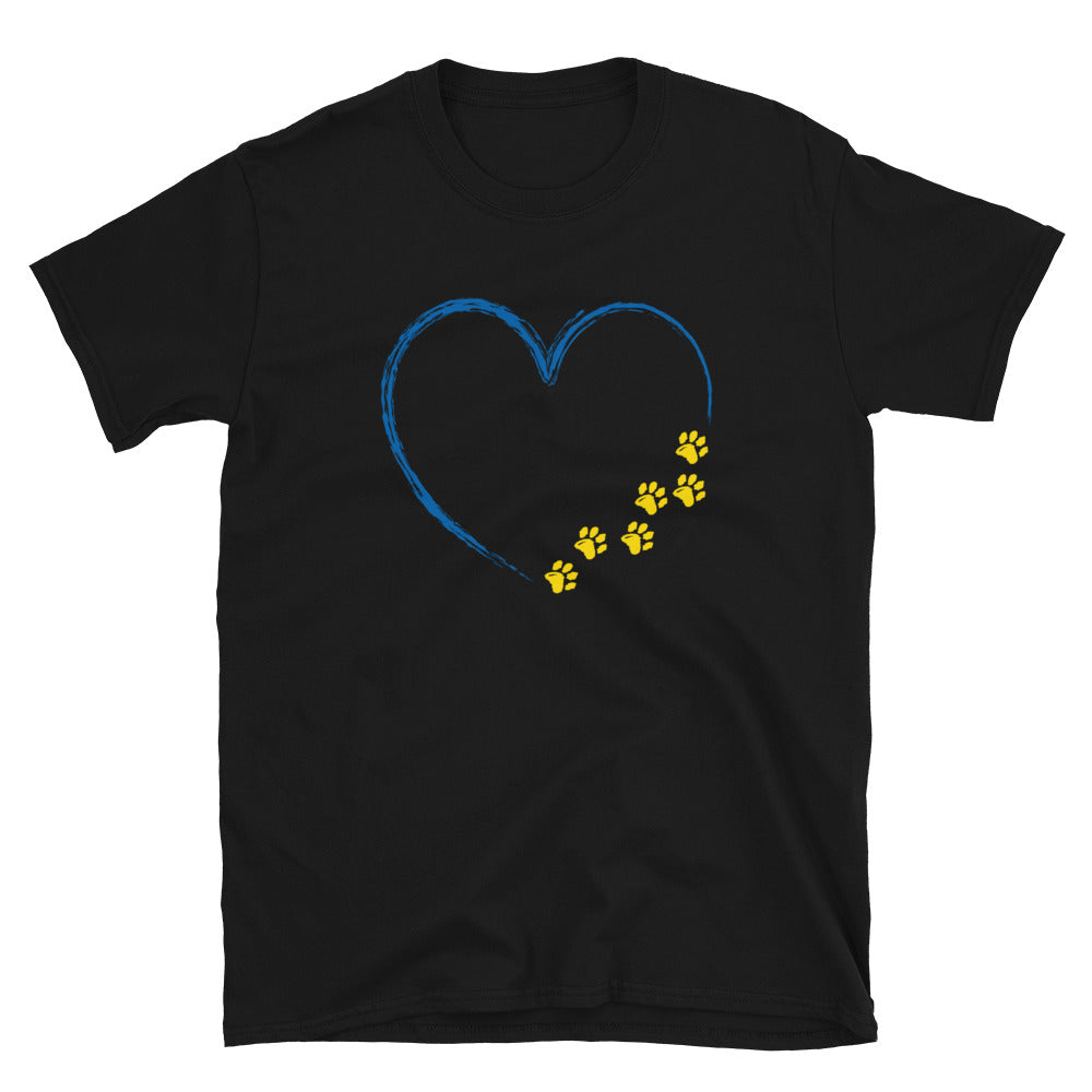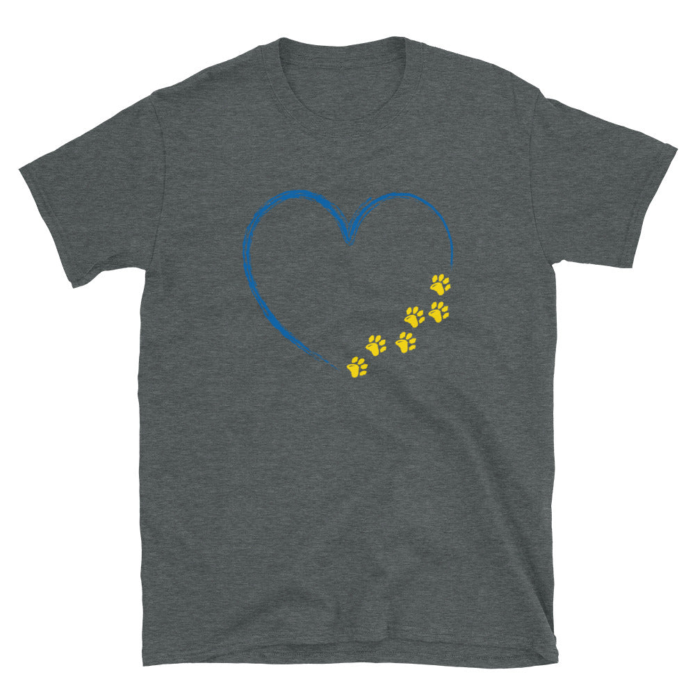 Really happy with this shirt! Excellent fit, great quality, and beautiful heart with paws design in Ukrainian flag colors. I wanted to help the animals there, so this was perfect.