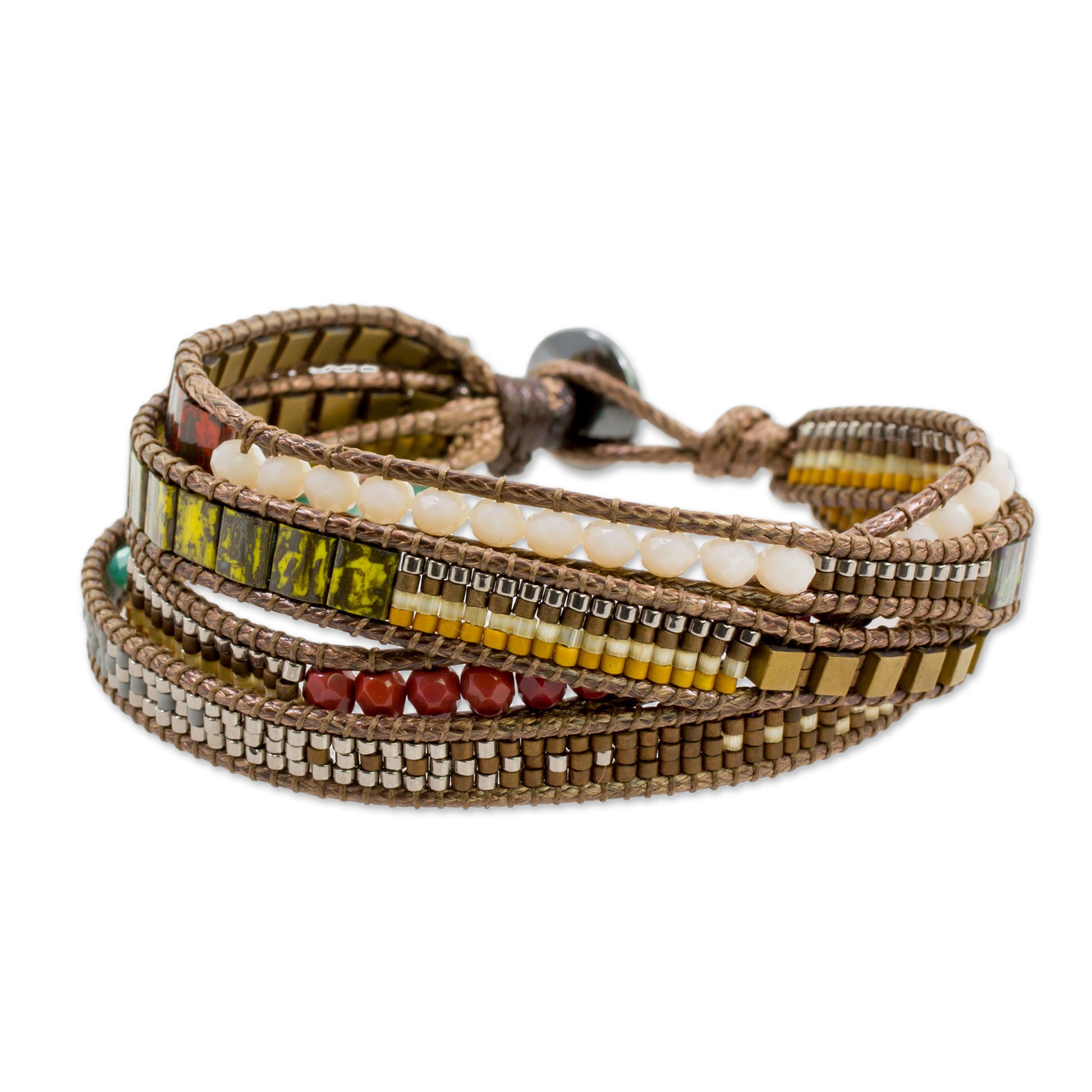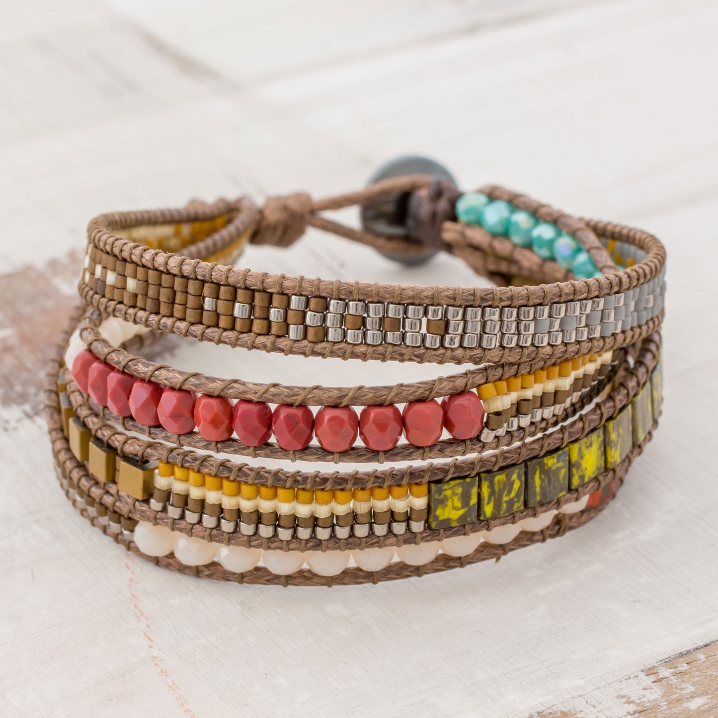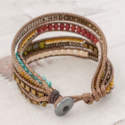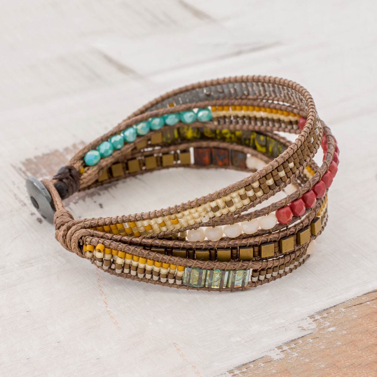 Featuring an eye-catching array of colors, this wristband bracelet features a handcrafted design by the Guatemalan artisans at Weaving Hands of Atitlan, who string petite glass beads on four strands of brown cord running side-by-side. Delightful and awe-inspiring, the bracelet possesses a universal beauty.