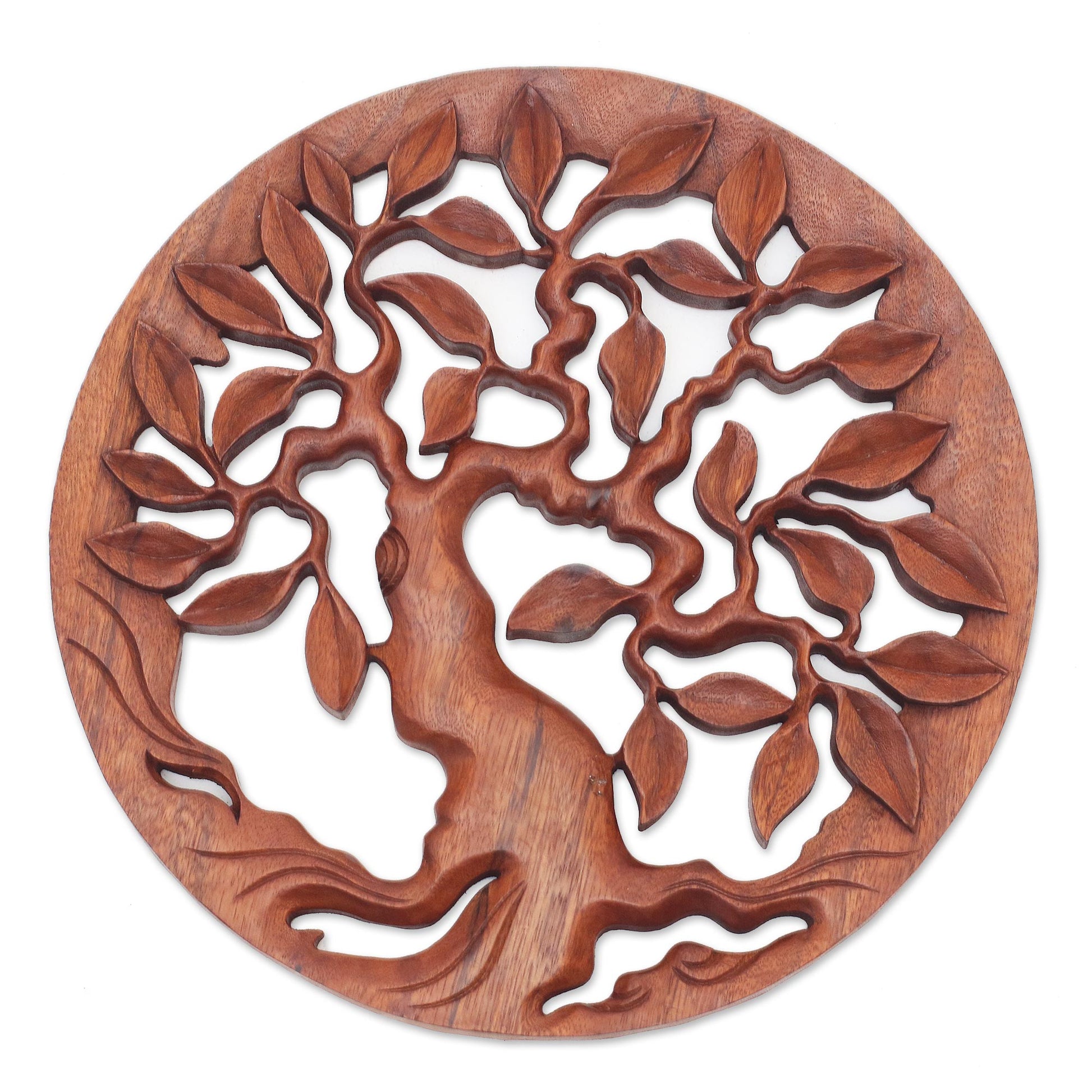 Enclosed in a circle, an ancient tree spreads benevolent branches from its strong trunk. Bali's Seji Taram carves the beautiful image from suar wood, polishing the relief panel to highlight the rich grain.