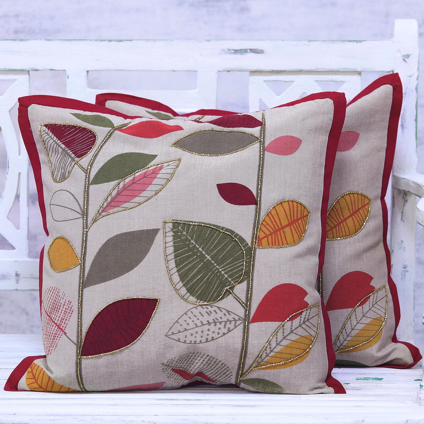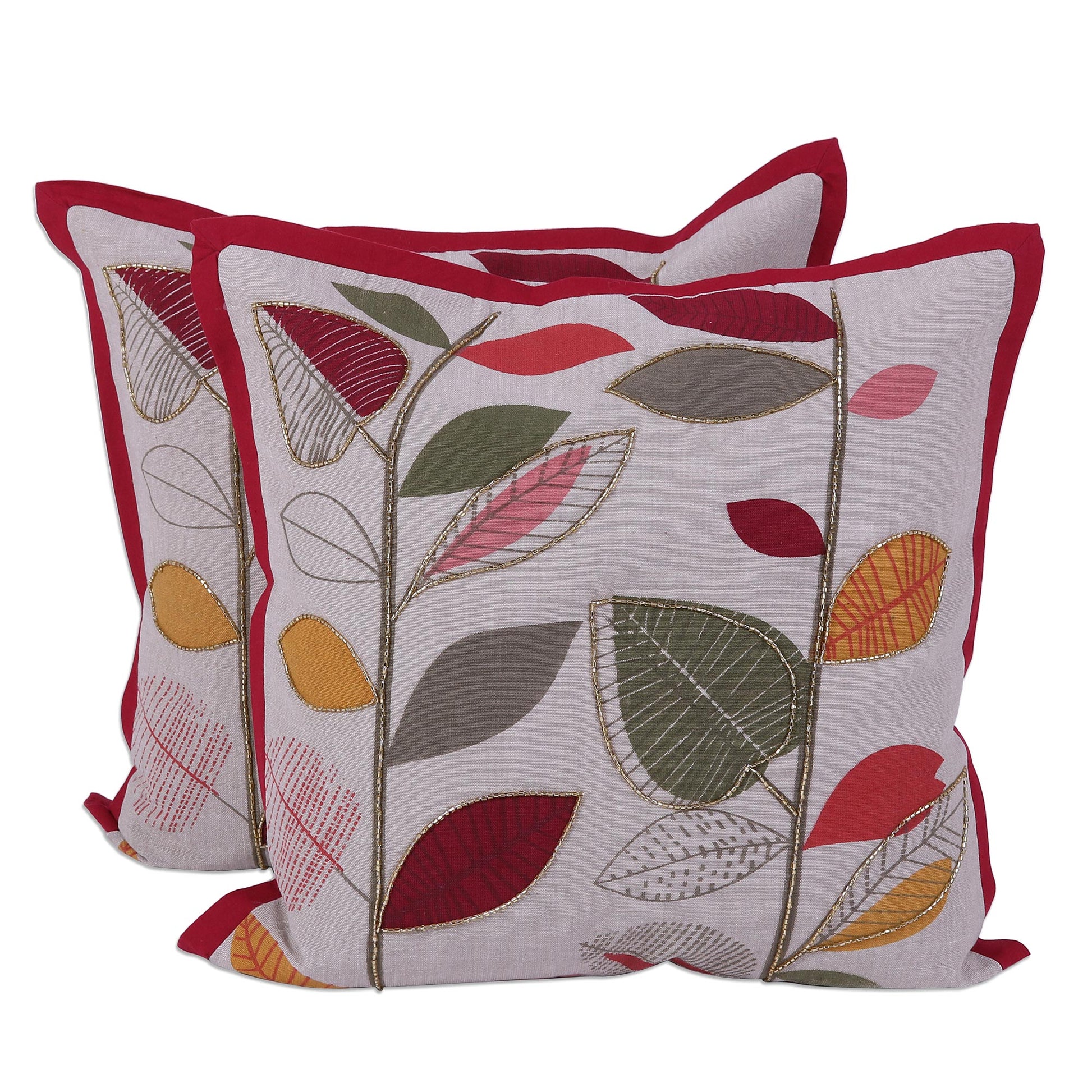 Vibrant Leaves Multicolored Cotton Cushion Covers with Leaf Motifs (Pair)