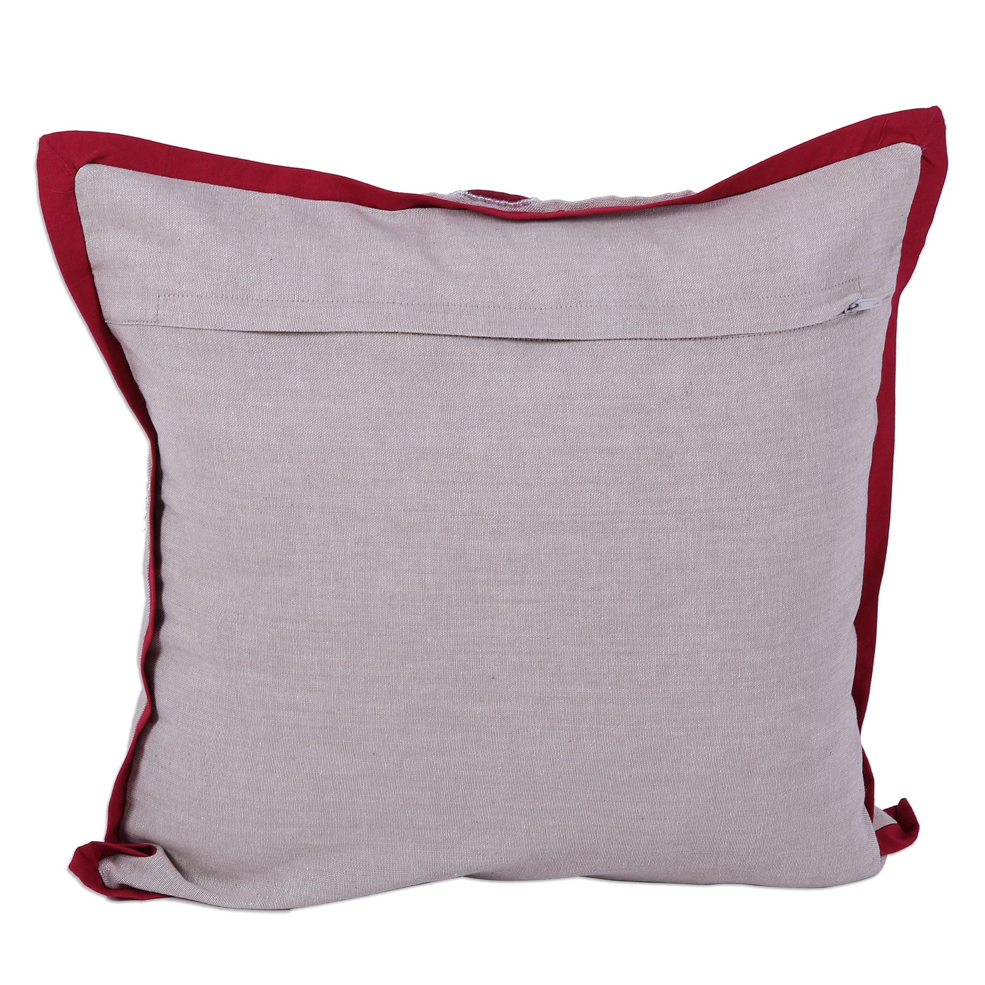 Presented by Seema in India, these cheerful cushion covers will brighten any space. Artisans print the leafy design on a pair of flax-colored cotton cushion covers, and embellish the motifs with tiny golden beads. The backs of the two cushion covers are solid cotton with concealed zipper openings for inserting the cushions. A claret-red flange completes the design.