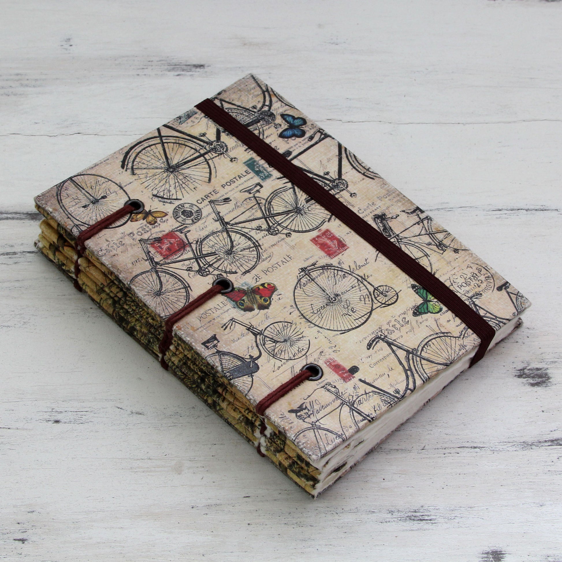 Asha Prabha uses replicas of ancient Indian postcards and stamp paper to create the covers of this journal. She adorns them with screen-printed vintage bicycles and colorful butterflies. The 60-page journal is crafted with handmade paper cut by hand for an added vintage rustic appearance. The journal is nicely bound together with waxed cotton thread, and a burgundy elastic cord keeps the journal closed.