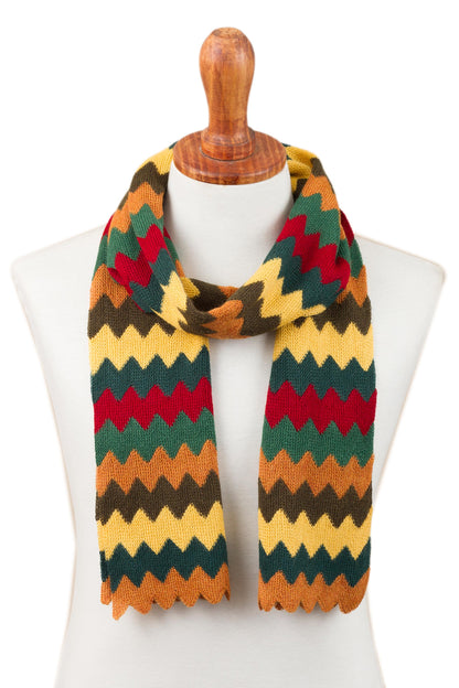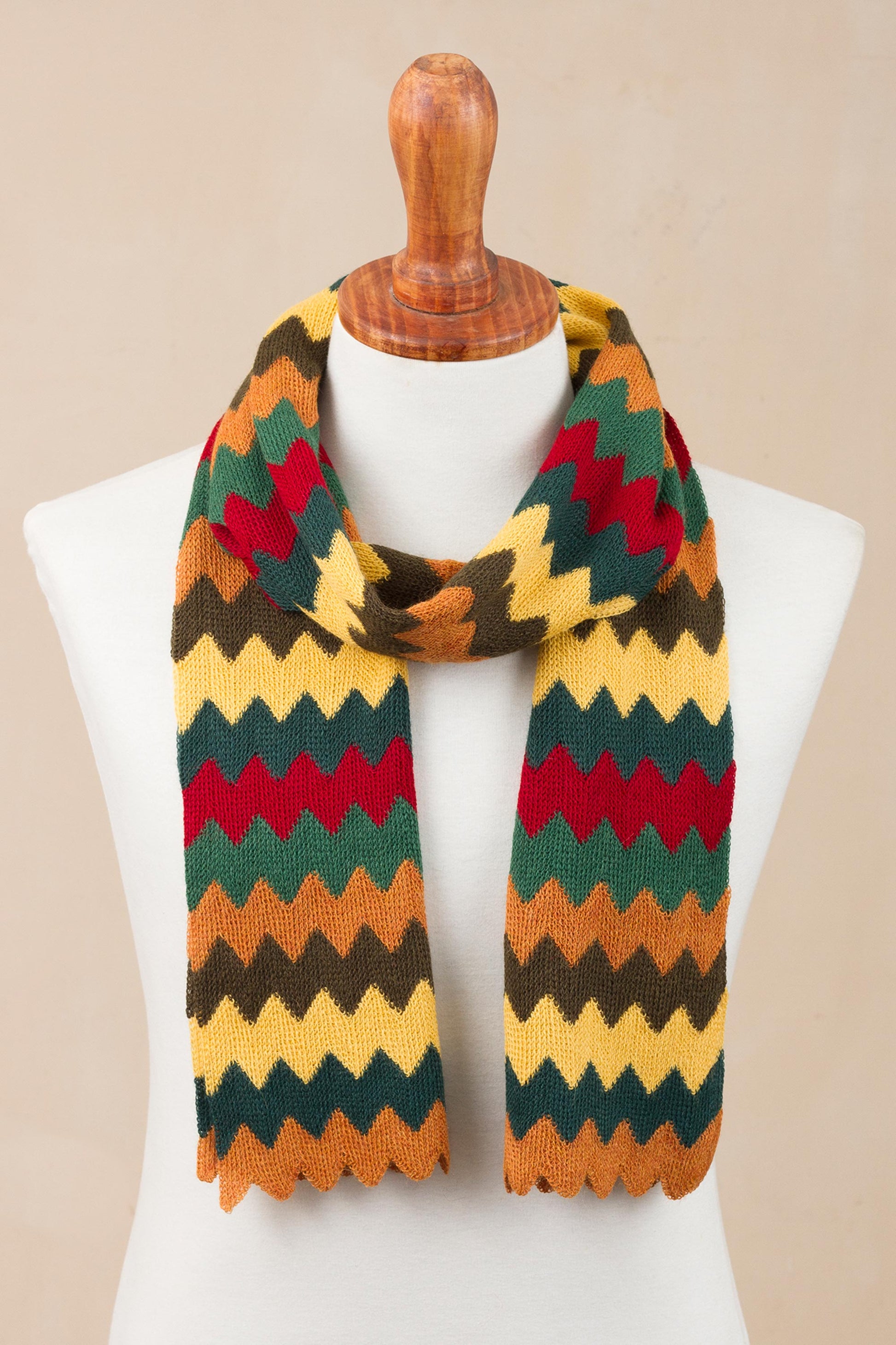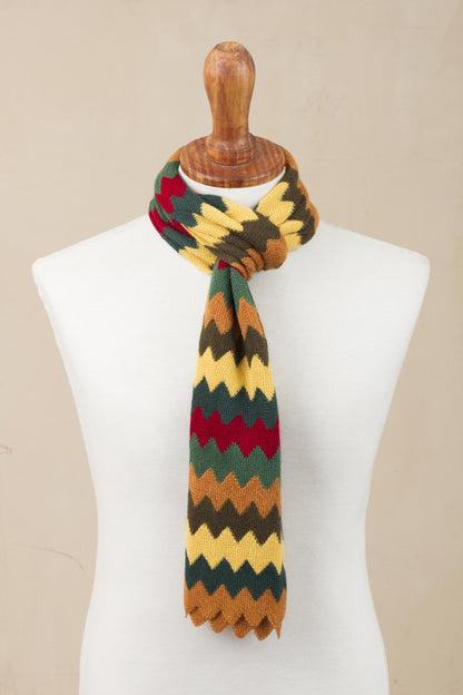 In warm hues of forest green, viridian, crimson, maize, and ginger, mesmerizing zigzag patterns decorate this wrap scarf from Peru. Alfredo Falcon designs this scarf, which he knits from a soft alpaca wool blend.