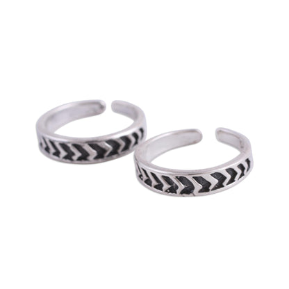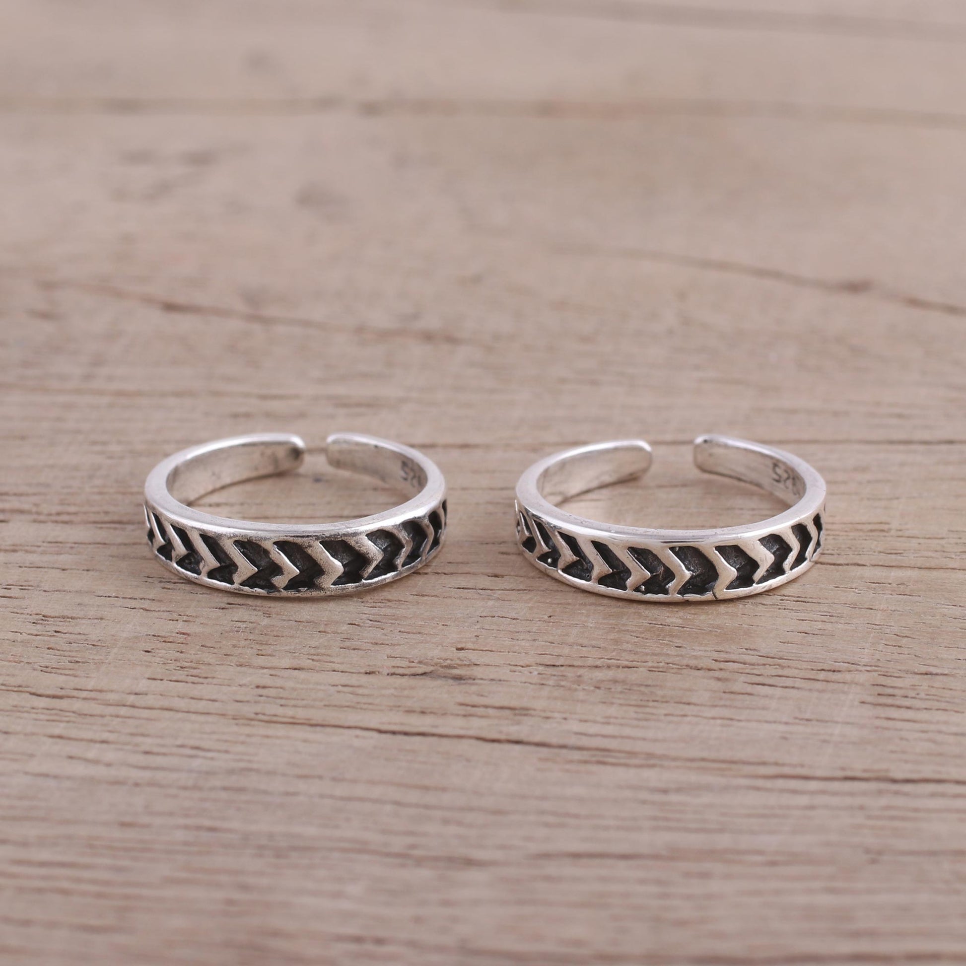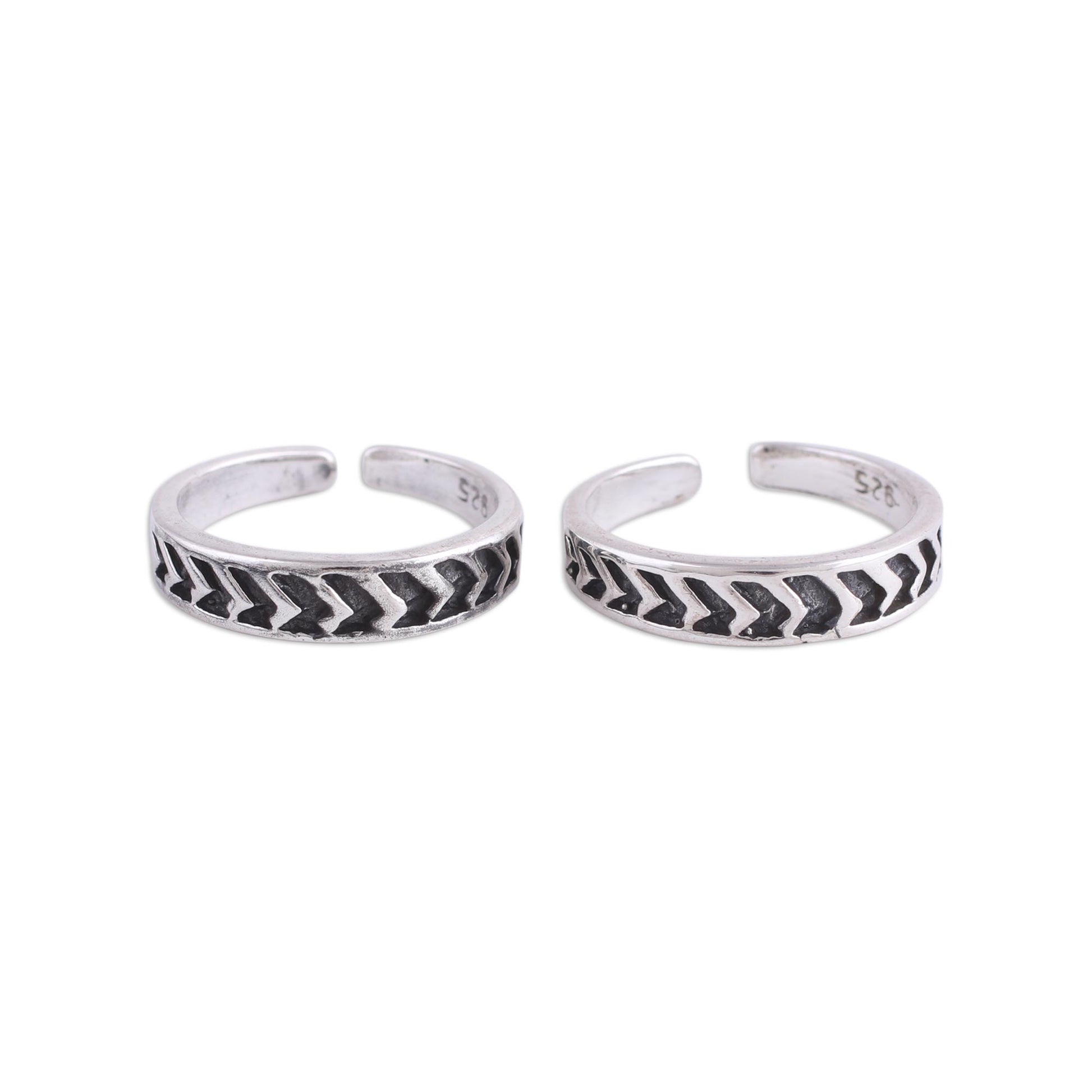 Find your own personal haven with this pair of dainty toe rings from India. Neetu Barathi designs the pair, crafting each one of sterling silver. Arrow patterns with a contrasting combination of finishes circle each ring.
