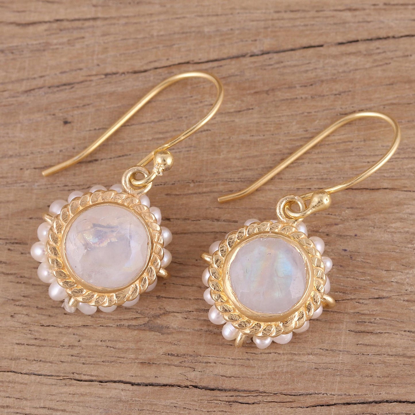 Like picturesque rays of sunlight surrounding the white-hot star that warms our planet, two 2.25 carat rainbow moonstones sit surrounded by dainty cultured pearls in unique dangle earrings. Vivek Nathany of India designs this elegant piece of jewelry with a 22k gold plated sterling silver. More than 30 cultured pearls encircle the rainbow moonstone with a twisted, rope-like setting.