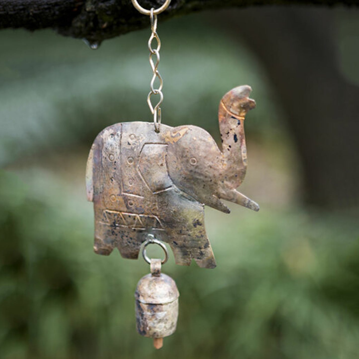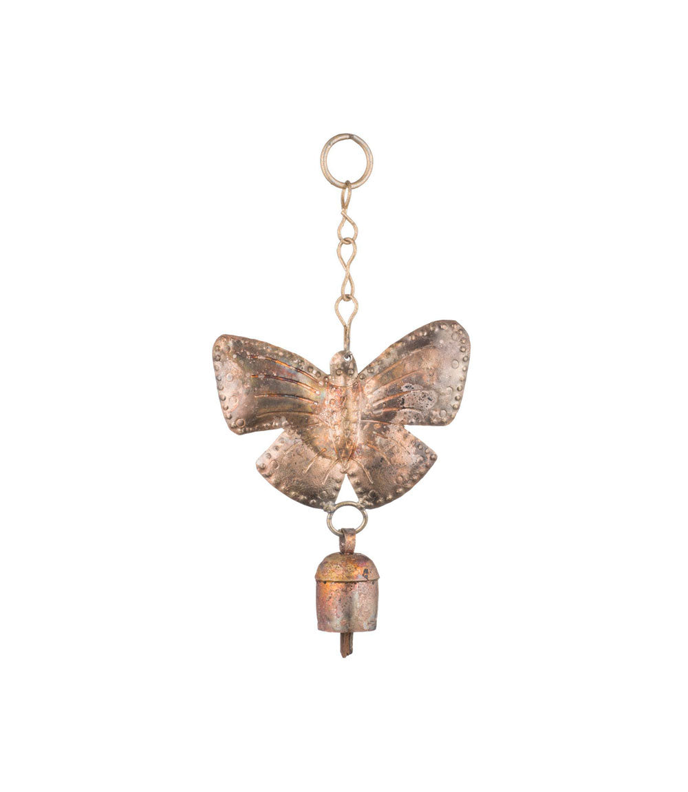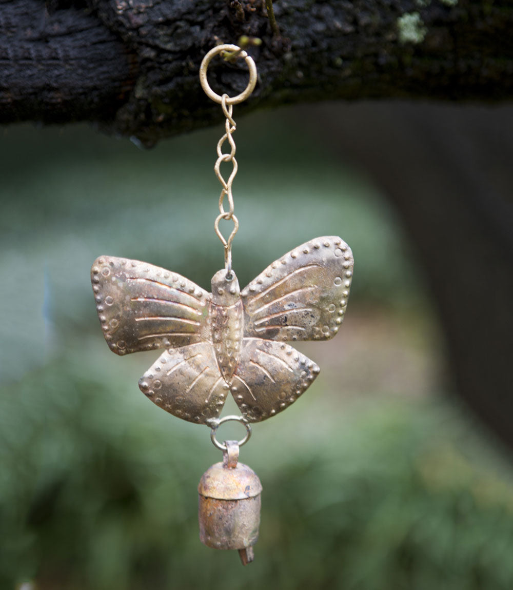 This beautifully hammered decorative butterfly or elephant over a small, recycled metal bell hangs wonderfully inside or outside your home for added charm.
