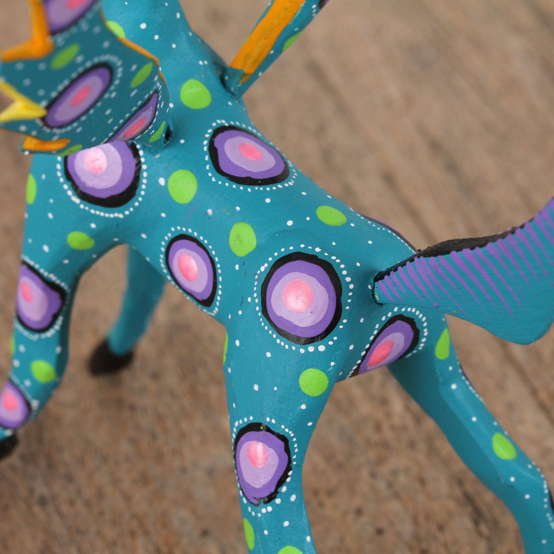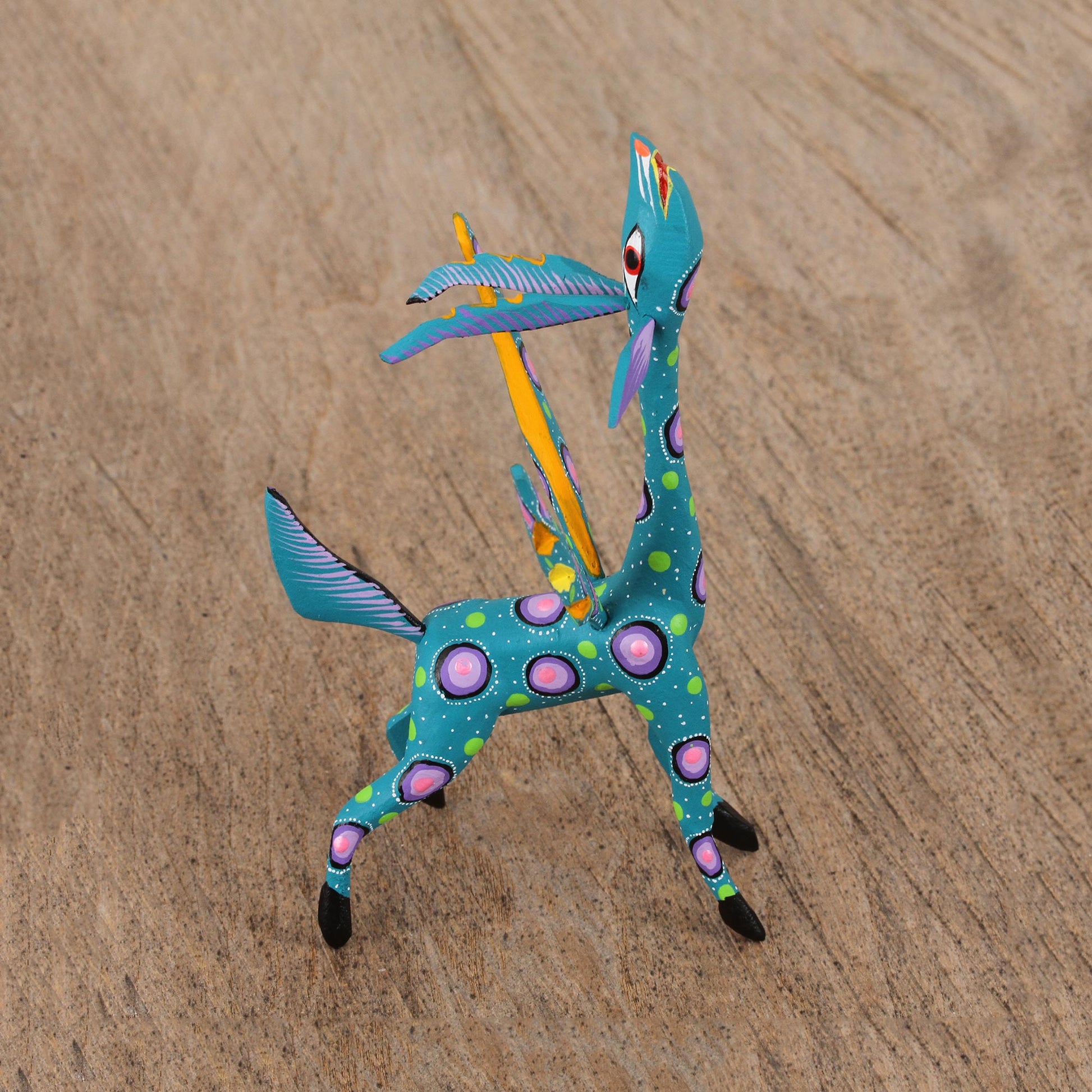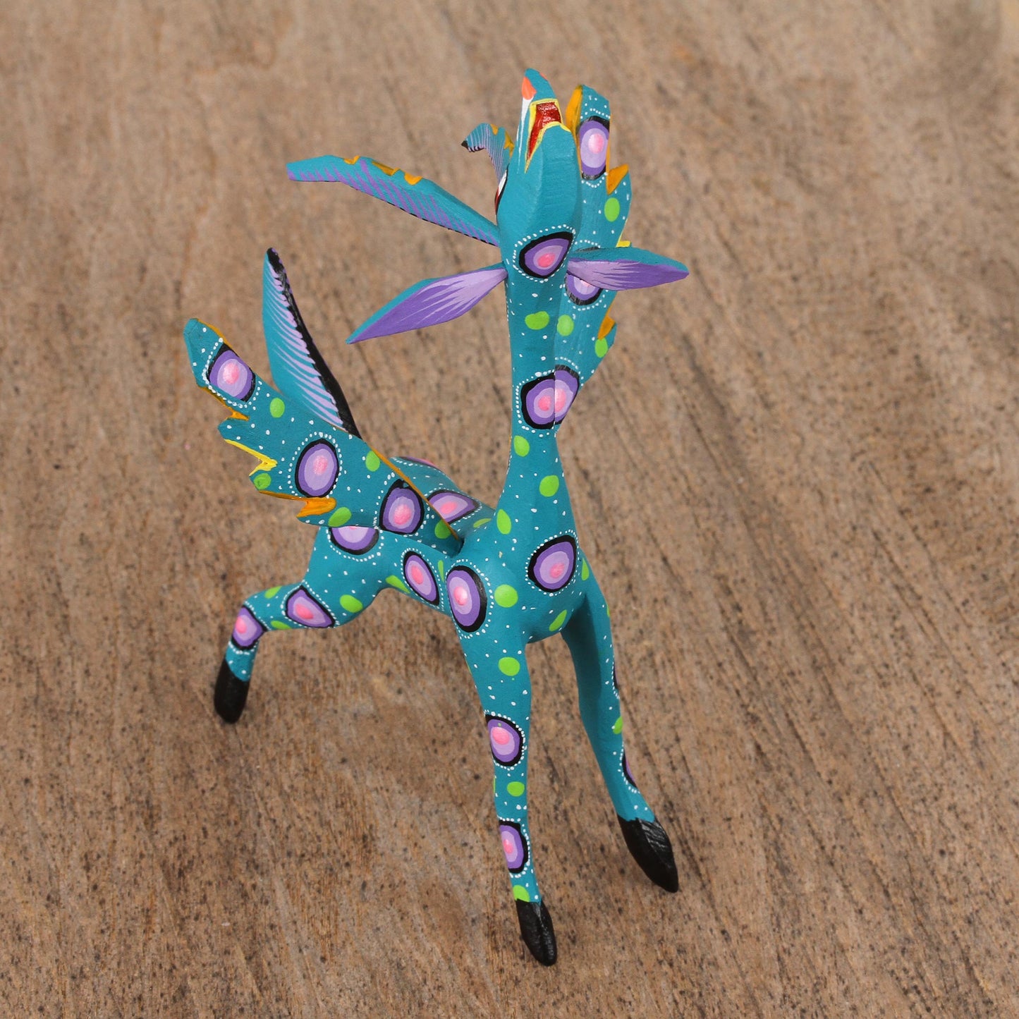 This graceful winged gazelle alebrije hand carved from copal wood is a beautiful teal blue with hand painted detailed circle and dot motifs in purple and green across his body. This alebrije is handcrafted by artisans Zeny and Reyna of Mexico. The gazelle's small parts are separated for shipping to protect from breakage.