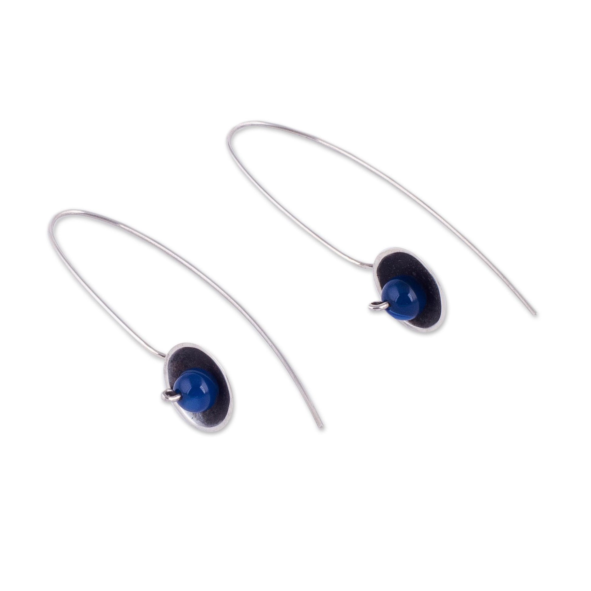 Sleek and minimalist, this pair of drop earrings is designed by Leslie Granthon of Peru. Hanging from silver hooks, blue agates lie within circles of oxidized sterling silver.
