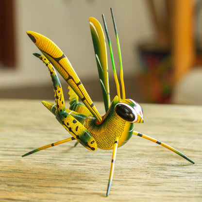 Yellow Good Luck Cricket Wood Alebrije Cricket Sculpture in Yellow from Mexico
