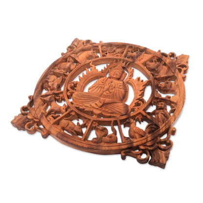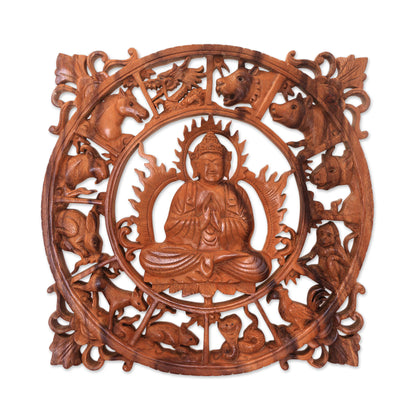 Zodiac Buddha Zodiac-Themed Buddha Wood Relief Panel from Bali